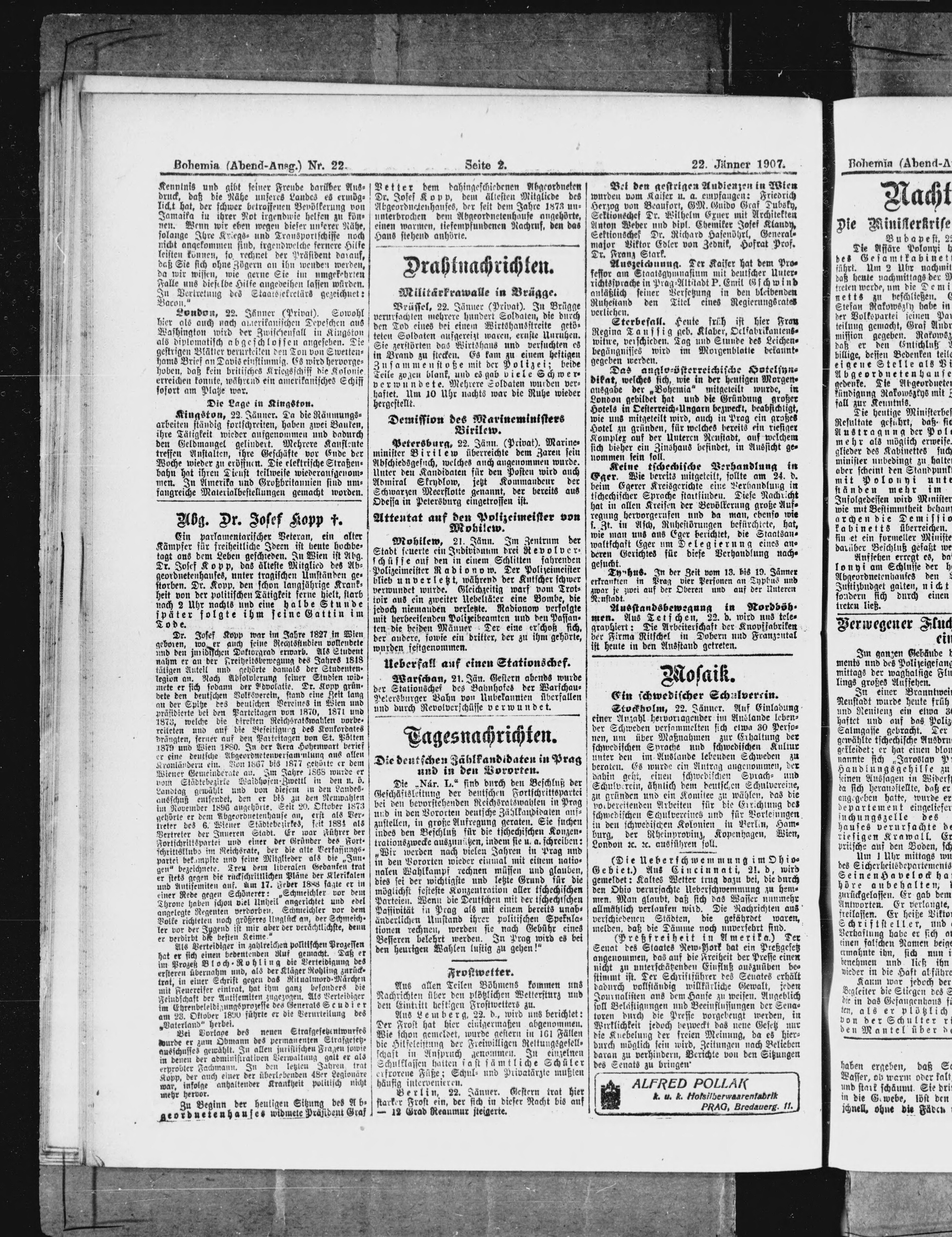 * Datum vydání výtisku: 22.1.1907 Číslo výtisku: 22 Poznámky k výtisku: večerní vydání