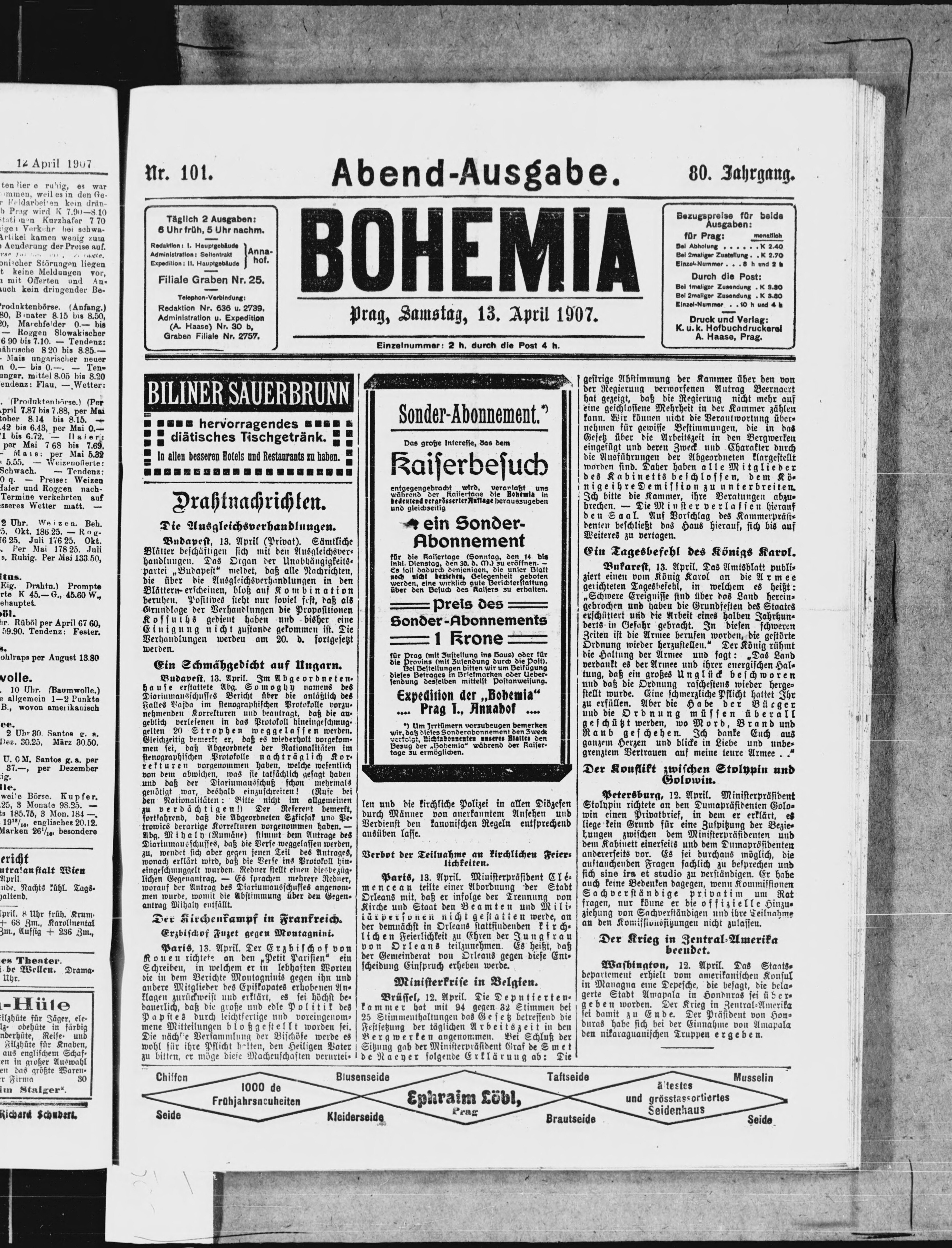 * Datum vydání výtisku: 13.4.1907 Číslo výtisku: 101 Poznámky k výtisku: večerní vydání