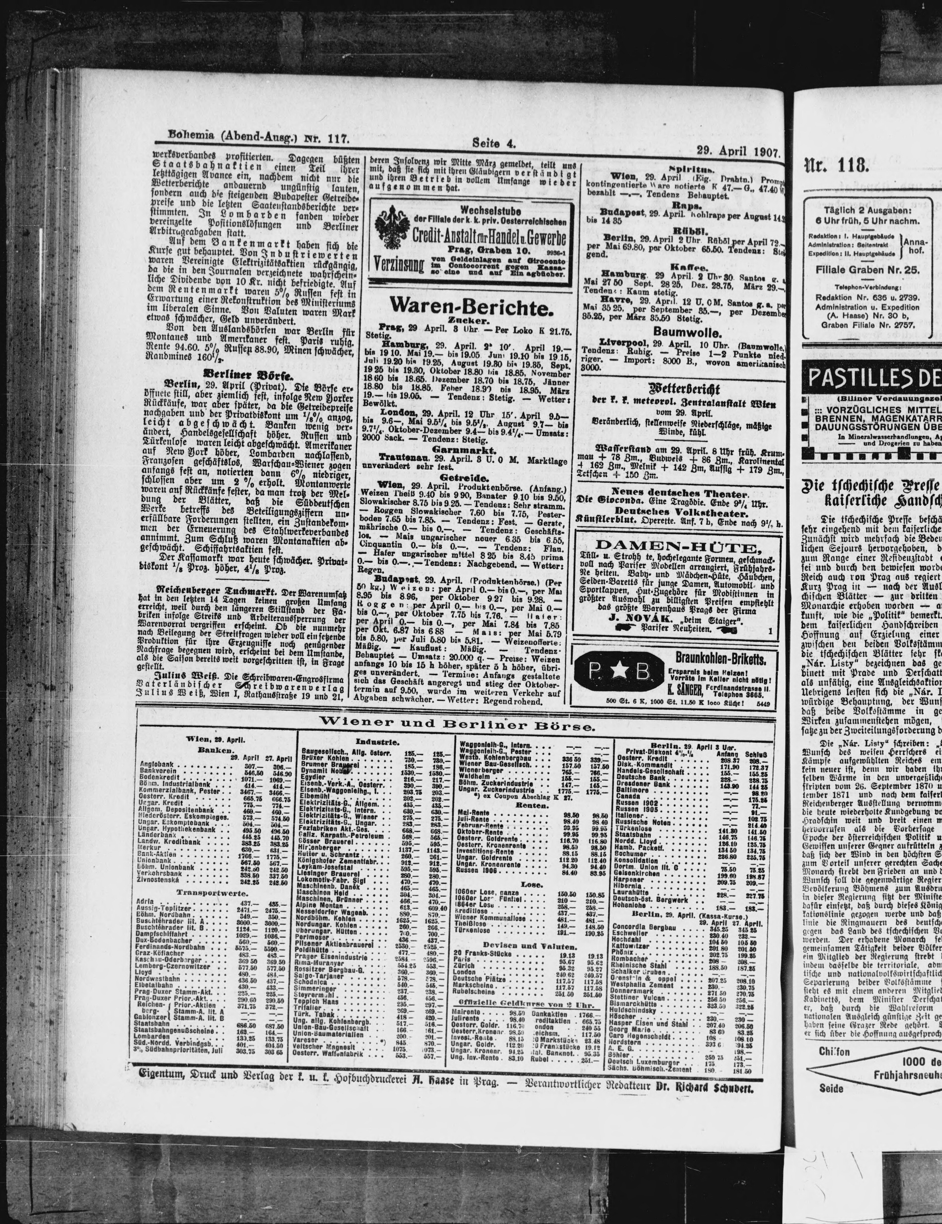 * Datum vydání výtisku: 29.4.1907 Číslo výtisku: 117 Poznámky k výtisku: večerní vydání