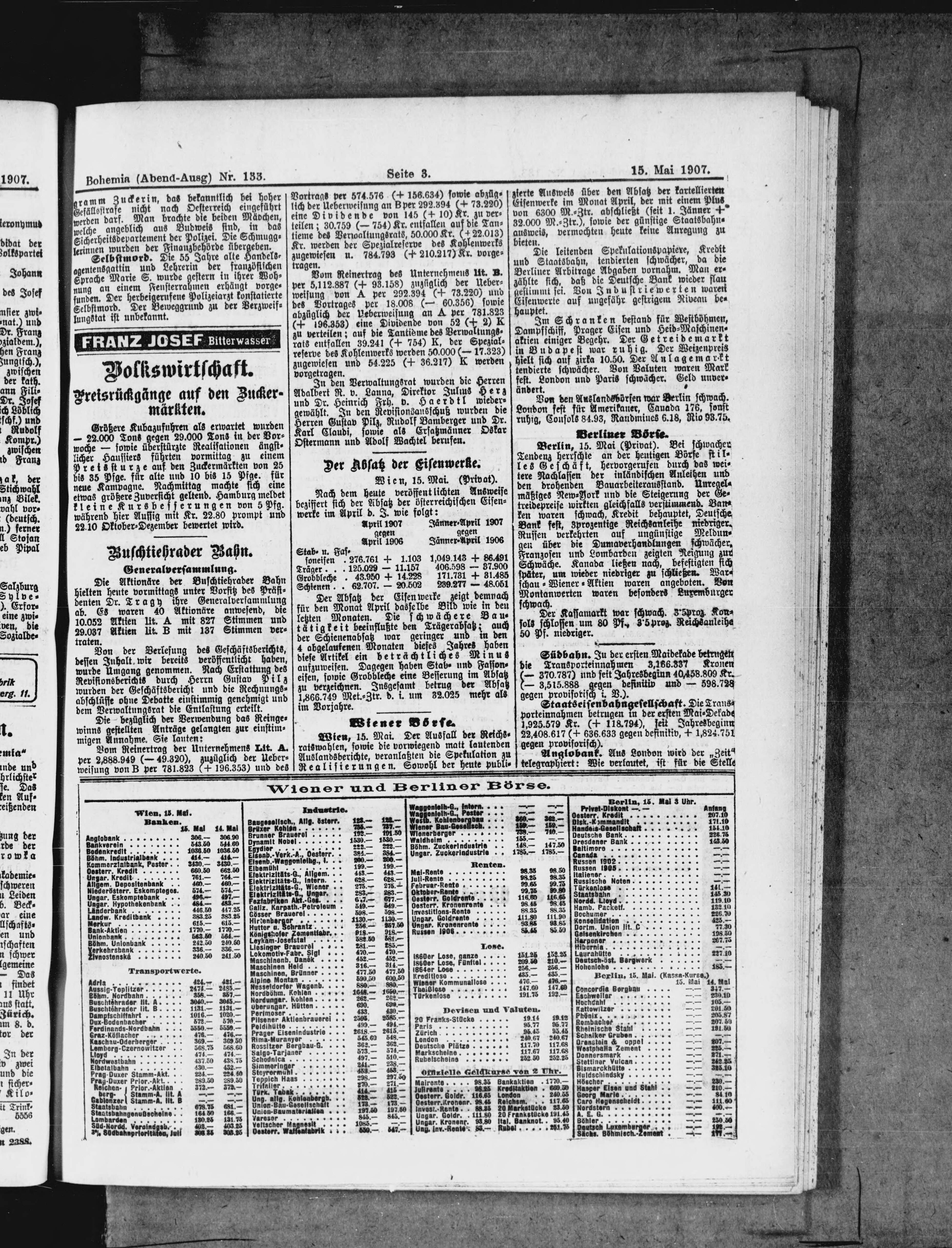 * Datum vydání výtisku: 15.5.1907 Číslo výtisku: 133 Poznámky k výtisku: večerní vydání