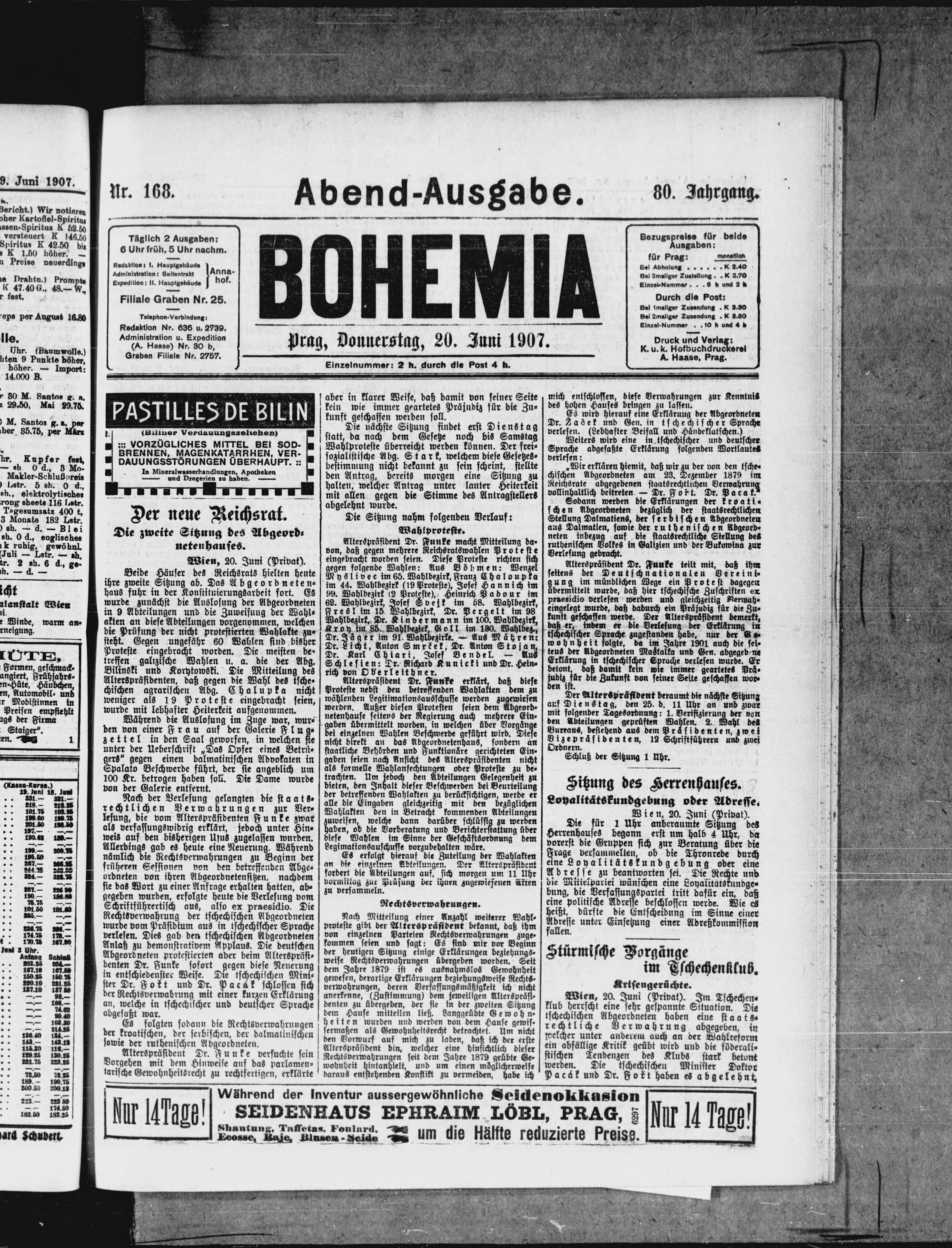 * Datum vydání výtisku: 20.6.1907 Číslo výtisku: 168 Poznámky k výtisku: večerní vydání