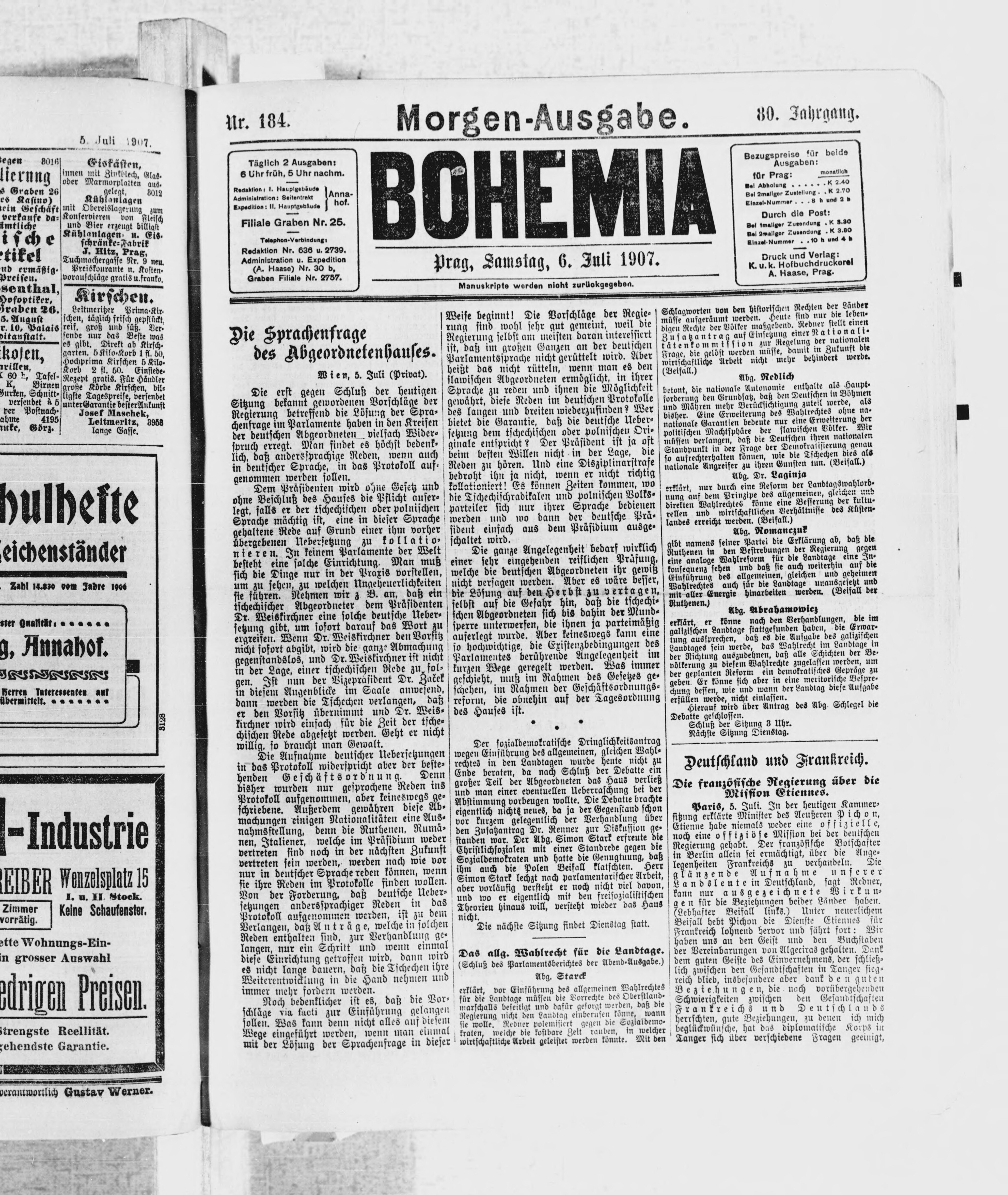* Datum vydání výtisku: 6.7.1907 Číslo výtisku: 184 Poznámky k výtisku: ranní vydání