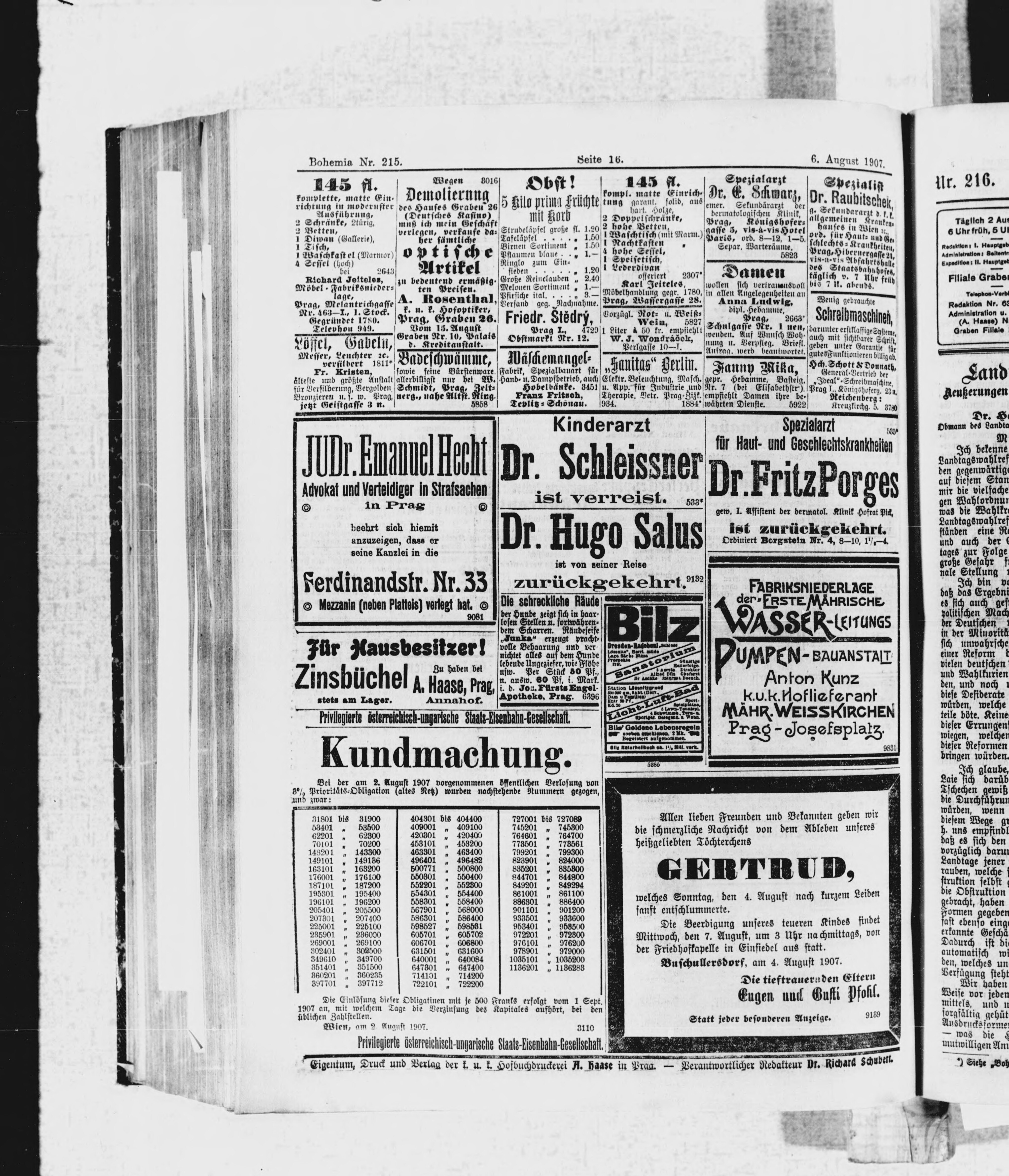 * Datum vydání výtisku: 6.8.1907 Číslo výtisku: 215 Poznámky k výtisku: ranní vydání