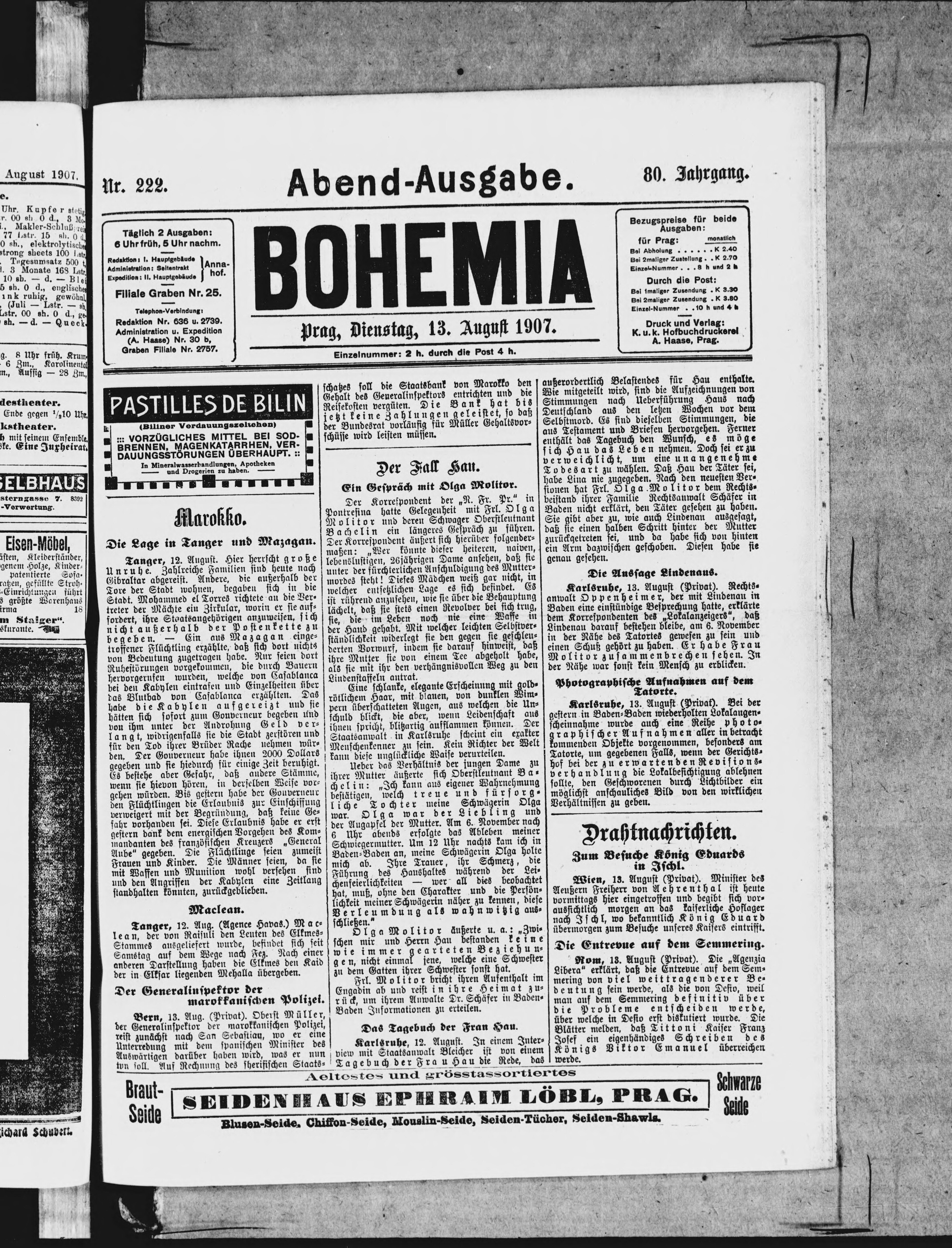 * Datum vydání výtisku: 13.8.1907 Číslo výtisku: 222 Poznámky k výtisku: večerní vydání