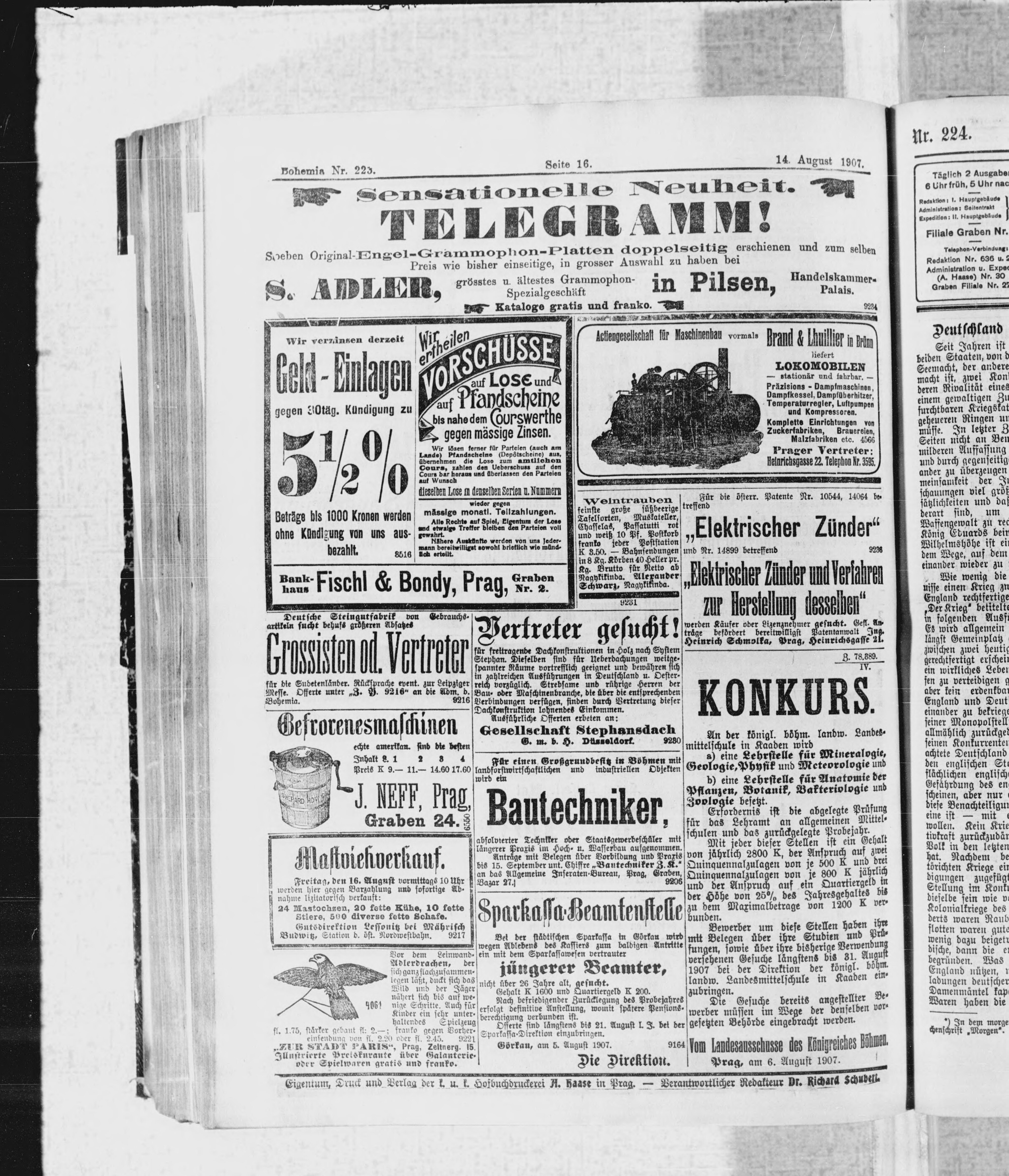 * Datum vydání výtisku: 14.8.1907 Číslo výtisku: 223 Poznámky k výtisku: ranní vydání