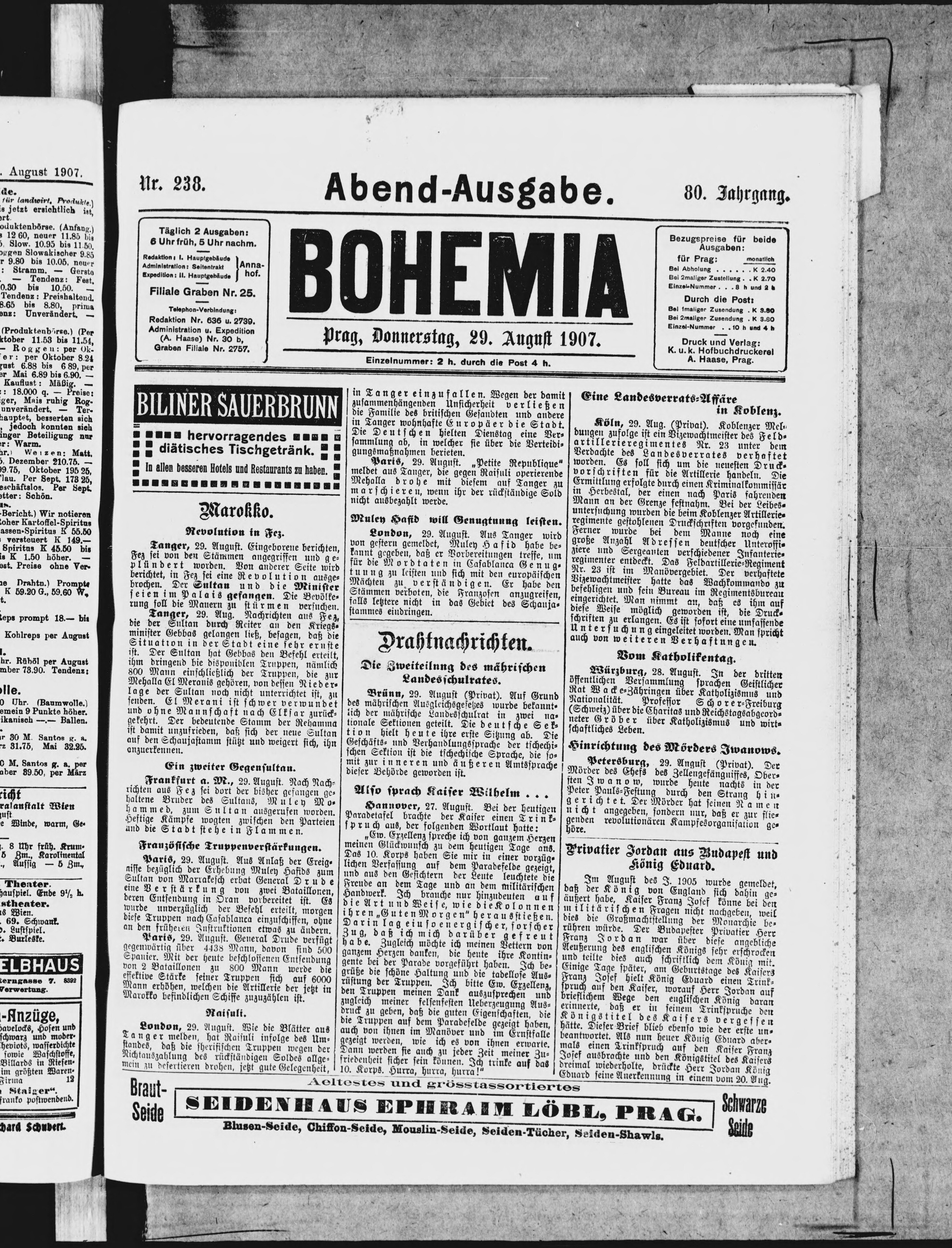 * Datum vydání výtisku: 29.8.1907 Číslo výtisku: 238 Poznámky k výtisku: večerní vydání