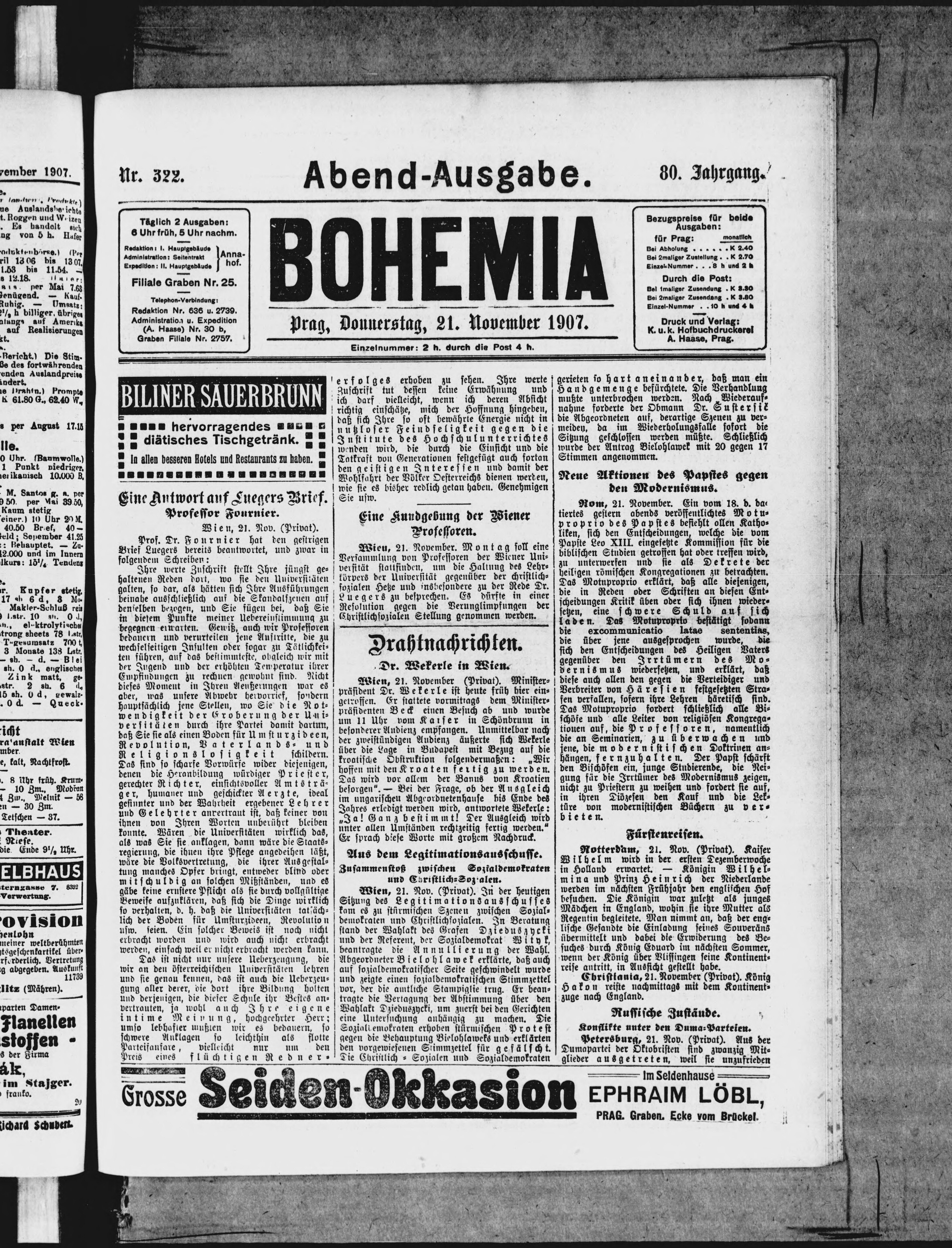 * Datum vydání výtisku: 21.11.1907 Číslo výtisku: 322 Poznámky k výtisku: večerní vydání