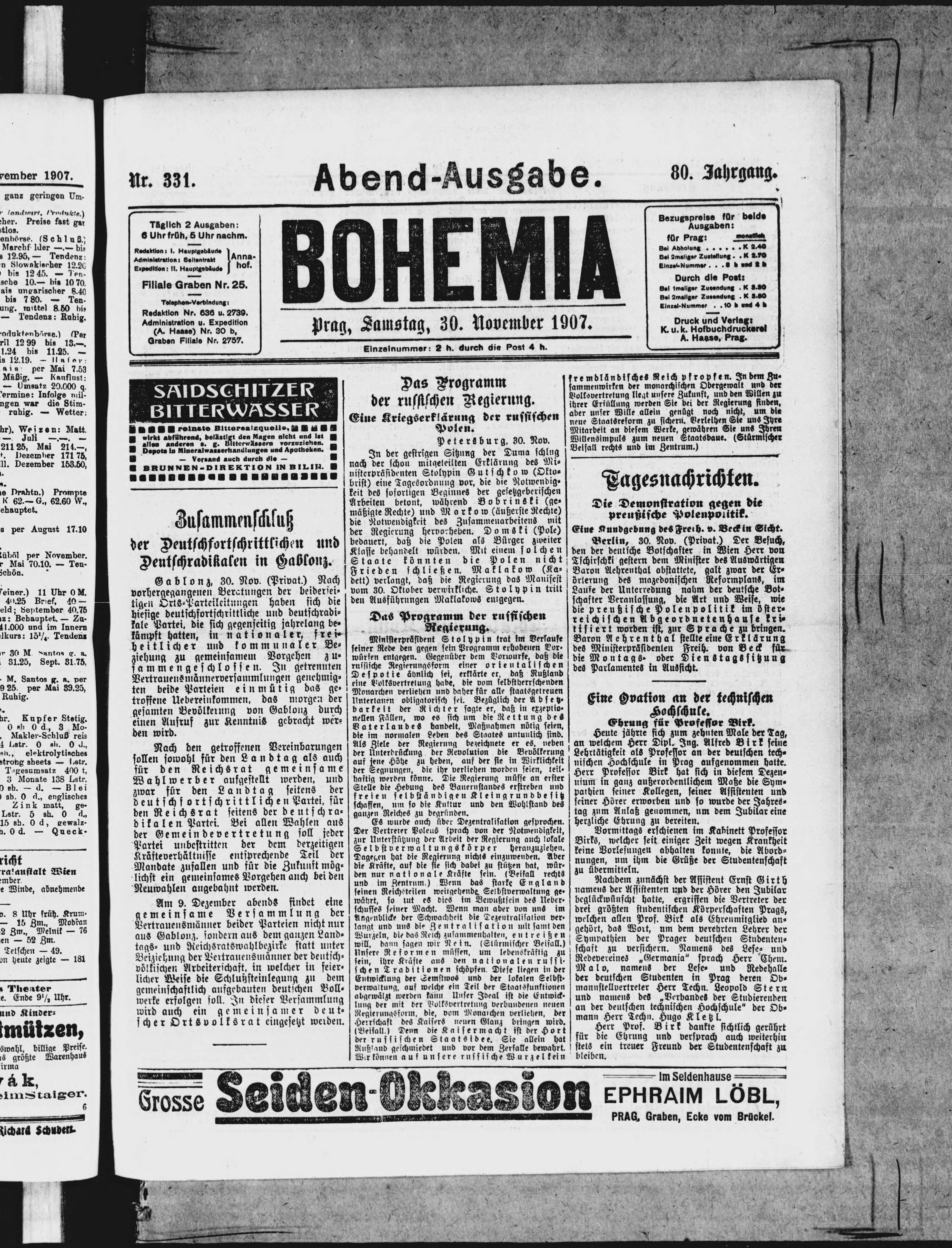 * Datum vydání výtisku: 30.11.1907 Číslo výtisku: 331 Poznámky k výtisku: večerní vydání