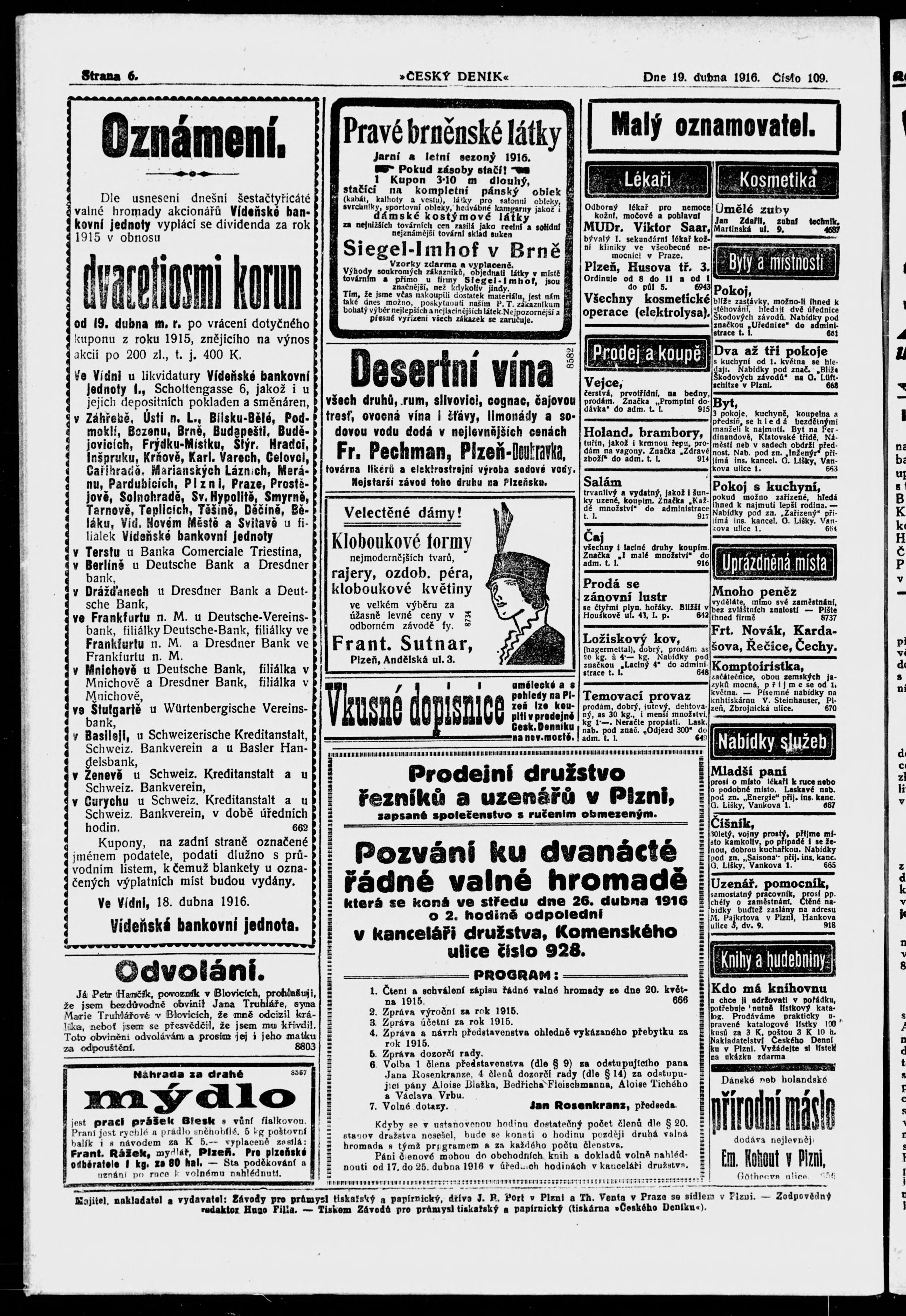 * Datum vydání výtisku: 19.4.1916 Číslo výtisku: 109