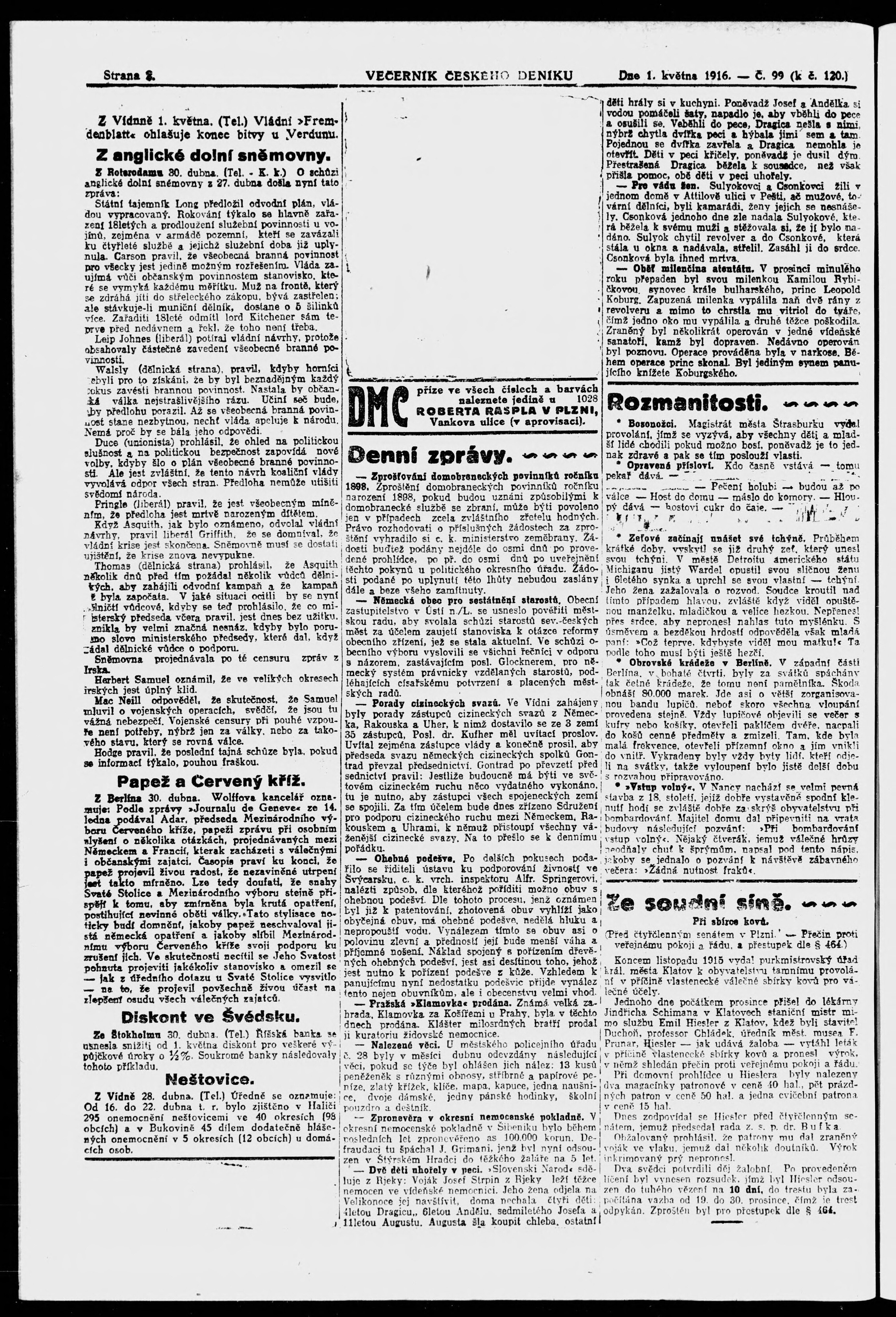 * Datum vydání výtisku: 1.5.1916 Číslo výtisku: 99 Poznámky k výtisku: večerní vydání;