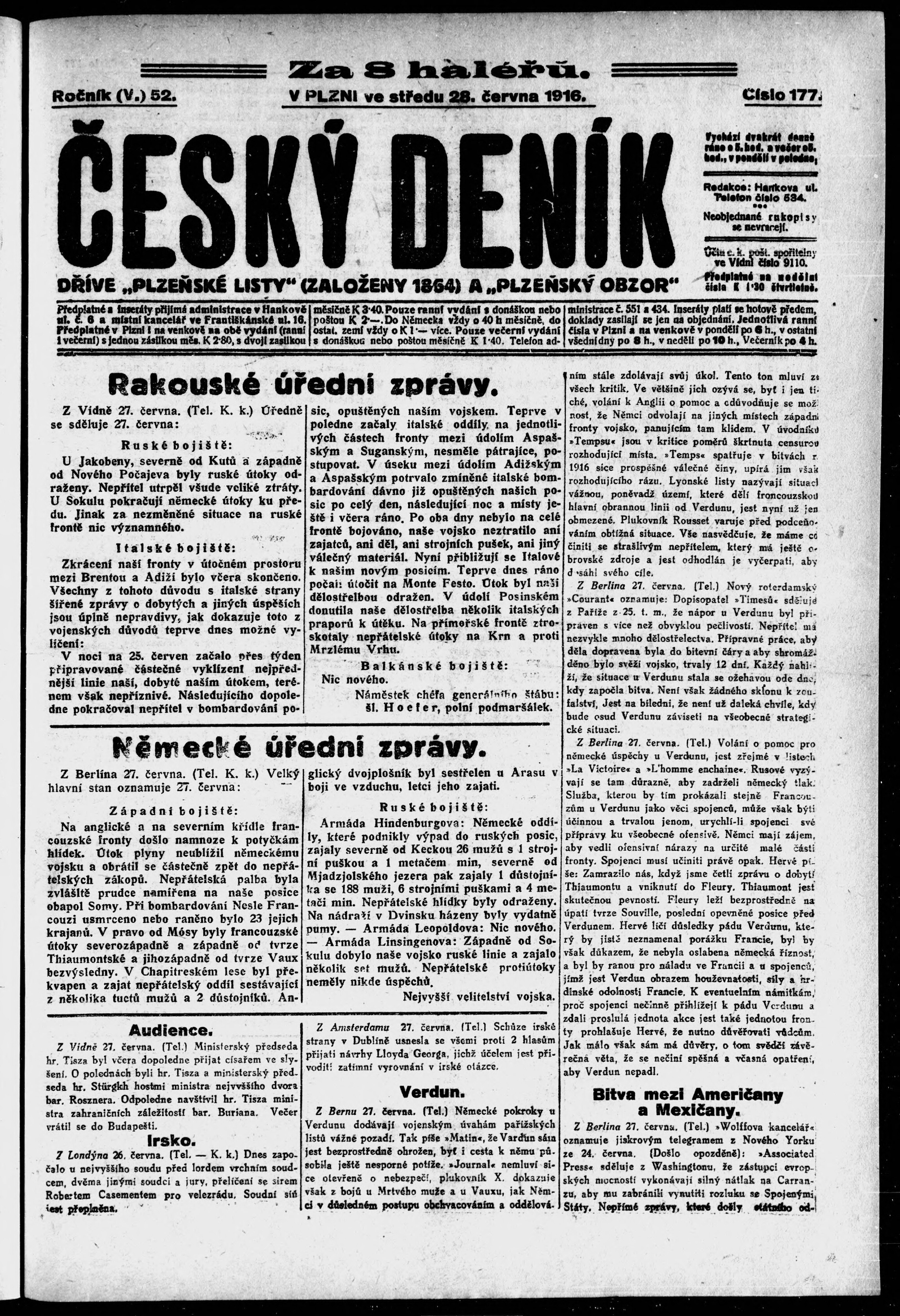 * Datum vydání výtisku: 28.6.1916 Číslo výtisku: 177