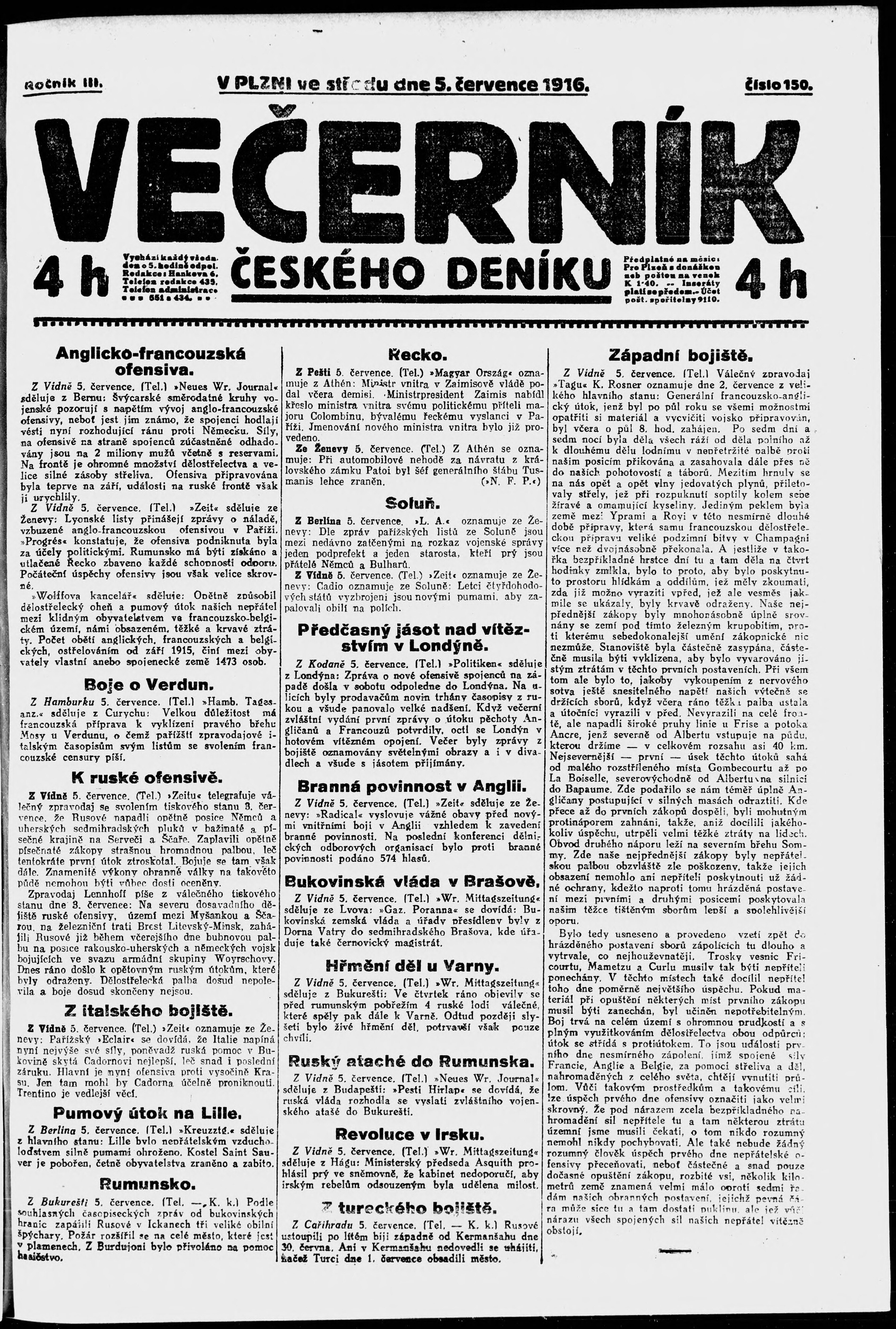* Datum vydání výtisku: 5.7.1916 Číslo výtisku: 150 Poznámky k výtisku: večerní vydání;