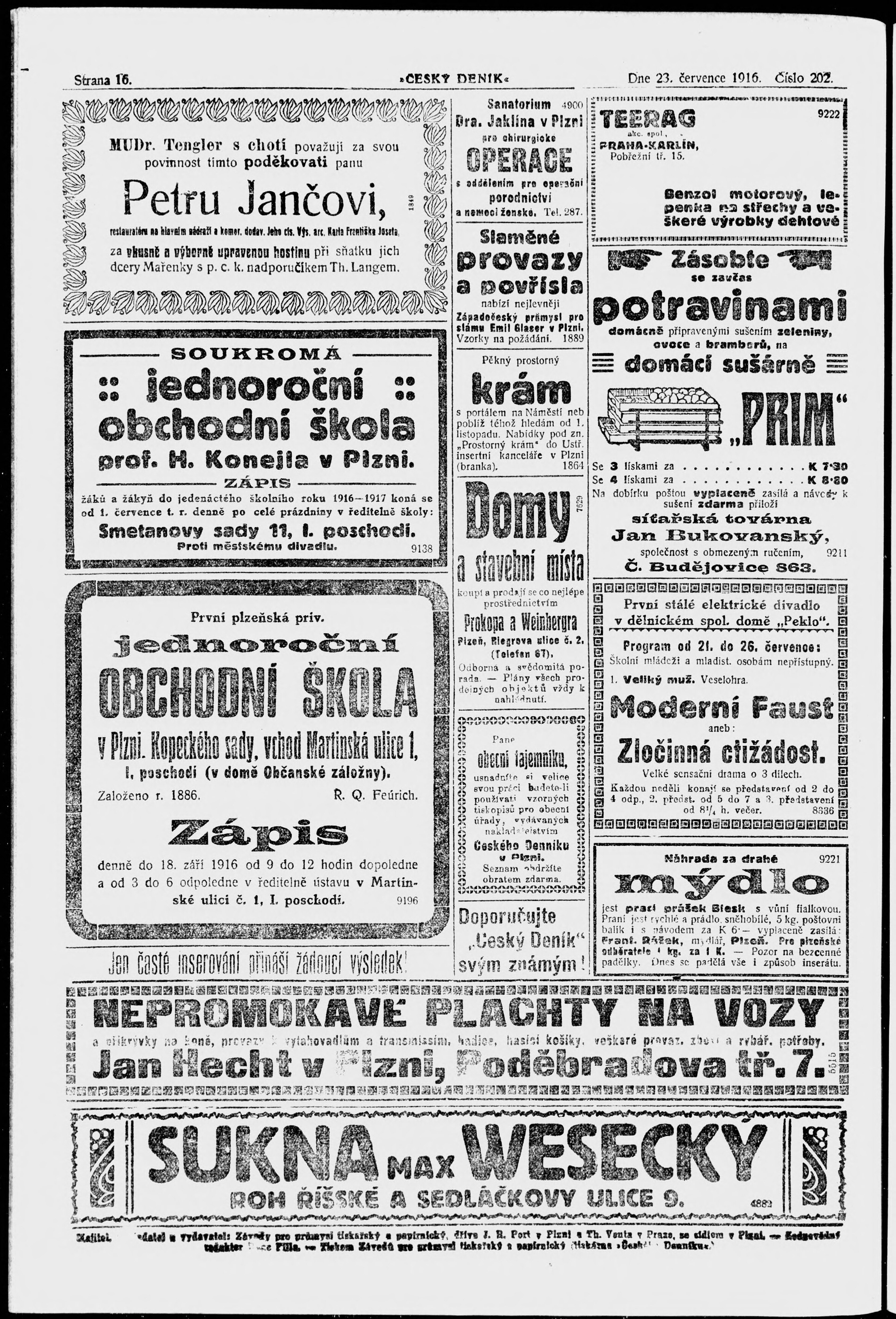 * Datum vydání výtisku: 23.7.1916 Číslo výtisku: 202 Poznámky k výtisku: posunutá paginace