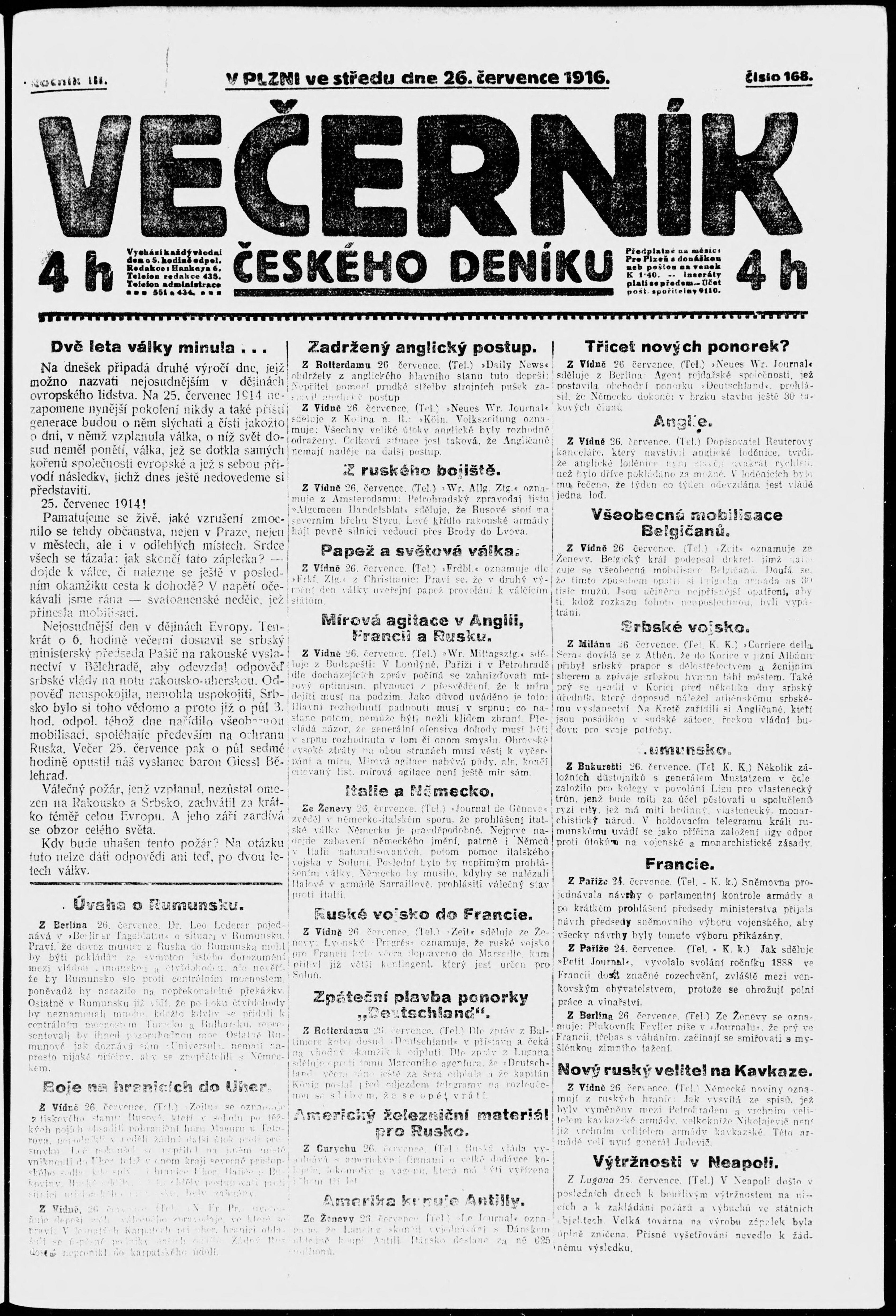 * Datum vydání výtisku: 26.7.1916 Číslo výtisku: 168 Poznámky k výtisku: večerní vydání;
