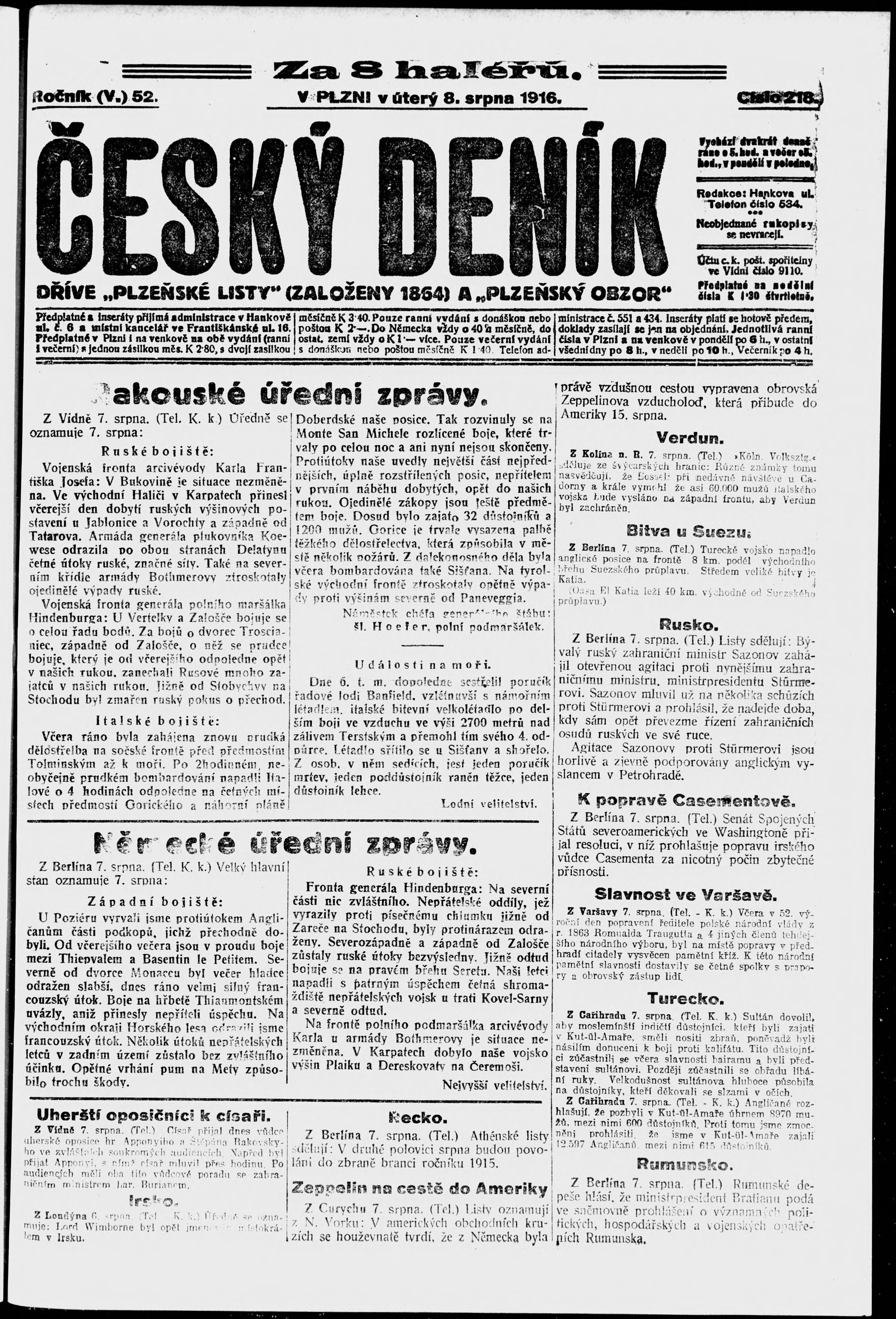 * Datum vydání výtisku: 8.8.1916 Číslo výtisku: 218