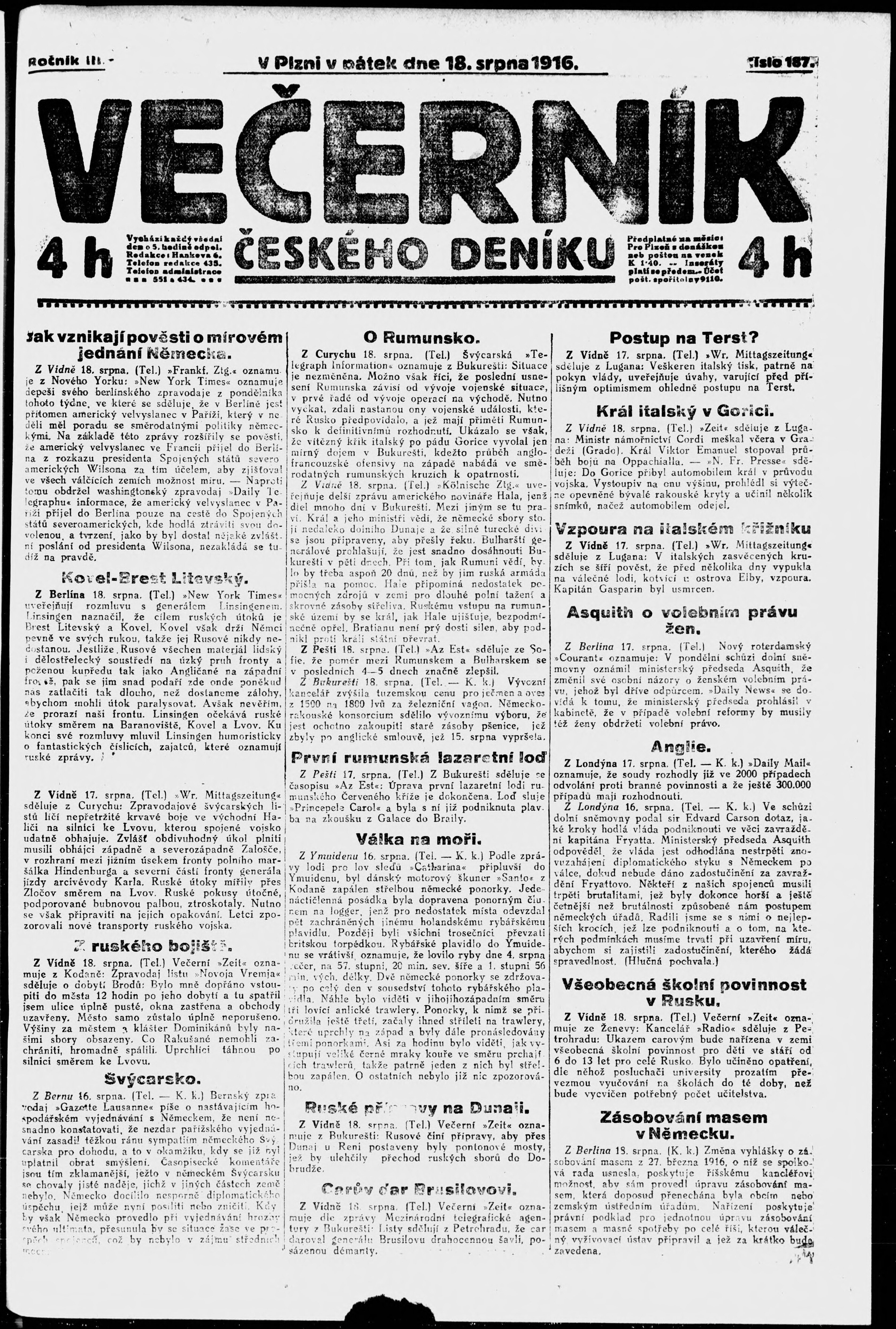 * Datum vydání výtisku: 18.8.1916 Číslo výtisku: 187 Poznámky k výtisku: večerní vydání;