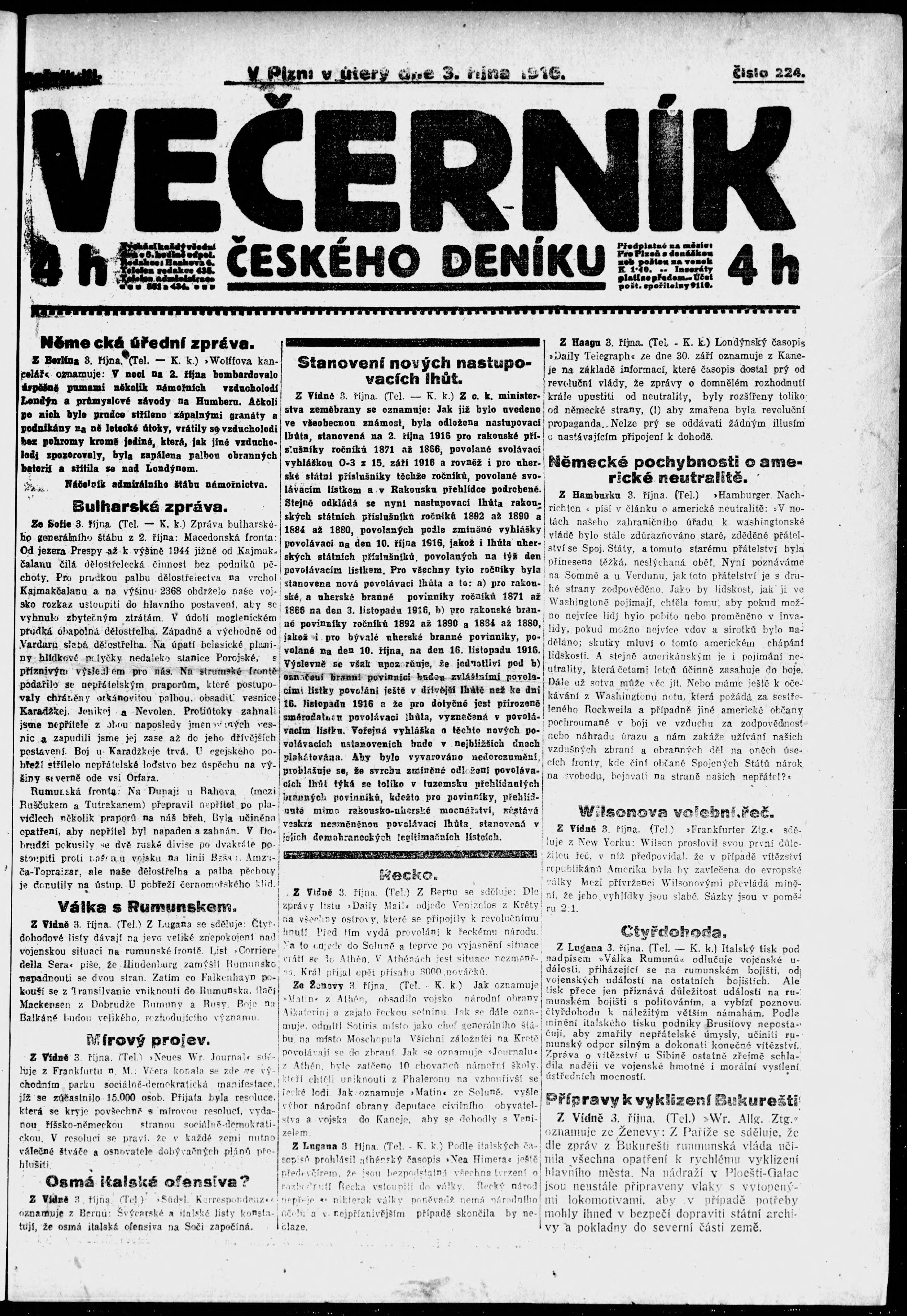 * Datum vydání výtisku: 3.10.1916 Číslo výtisku: 224 Poznámky k výtisku: večerní vydání;