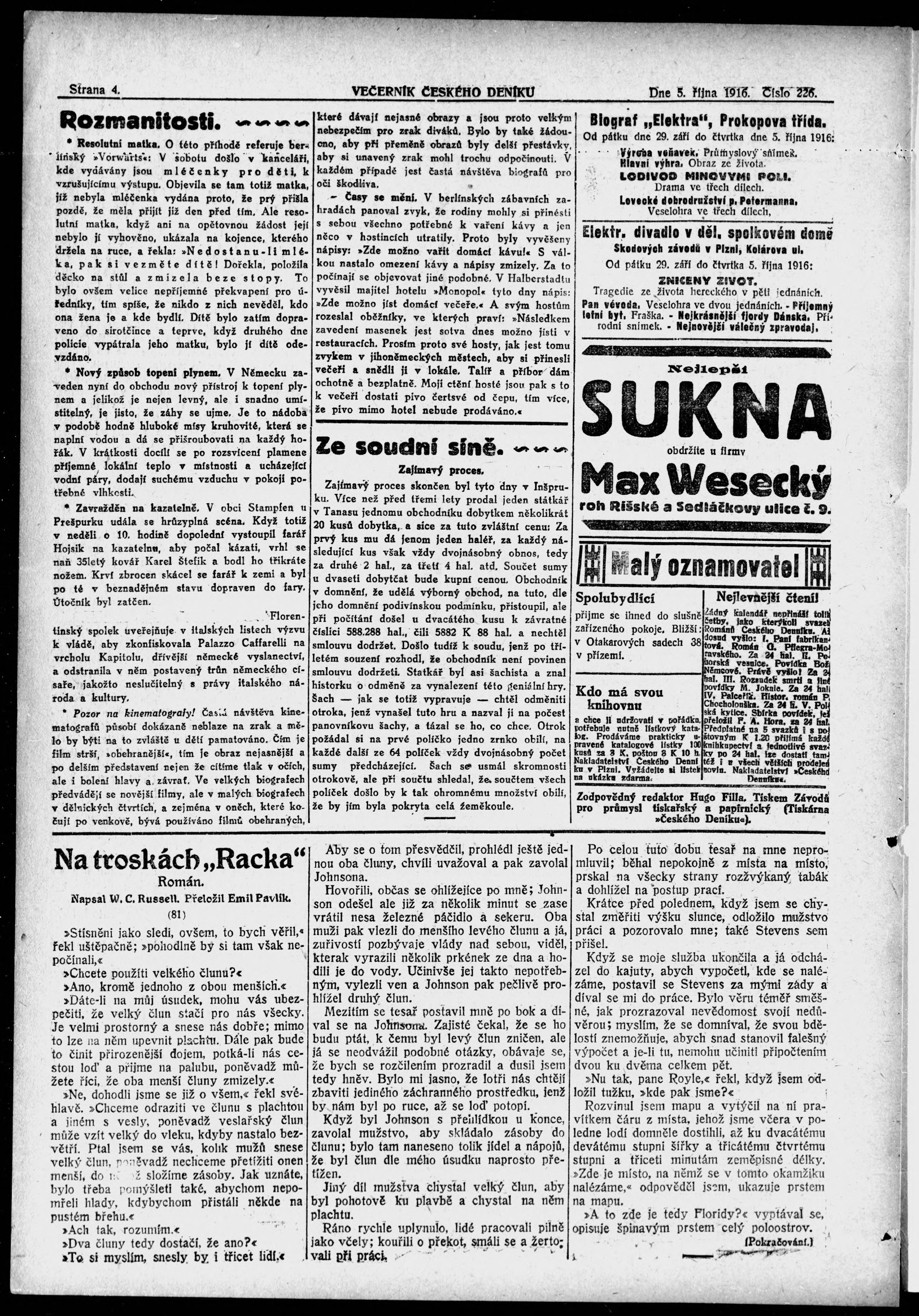 * Datum vydání výtisku: 5.10.1916 Číslo výtisku: 226 Poznámky k výtisku: večerní vydání;