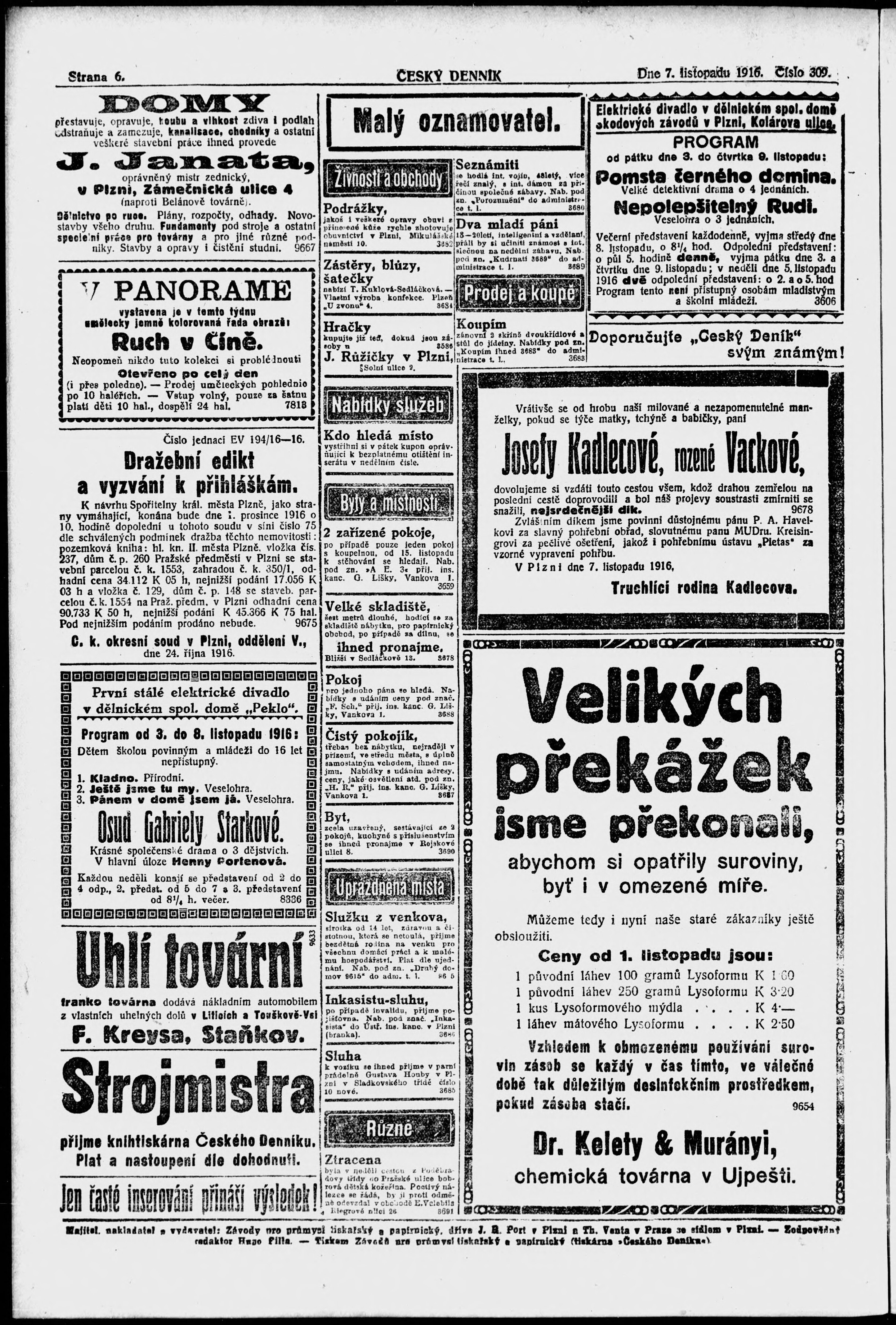 * Datum vydání výtisku: 7.11.1916 Číslo výtisku: 309