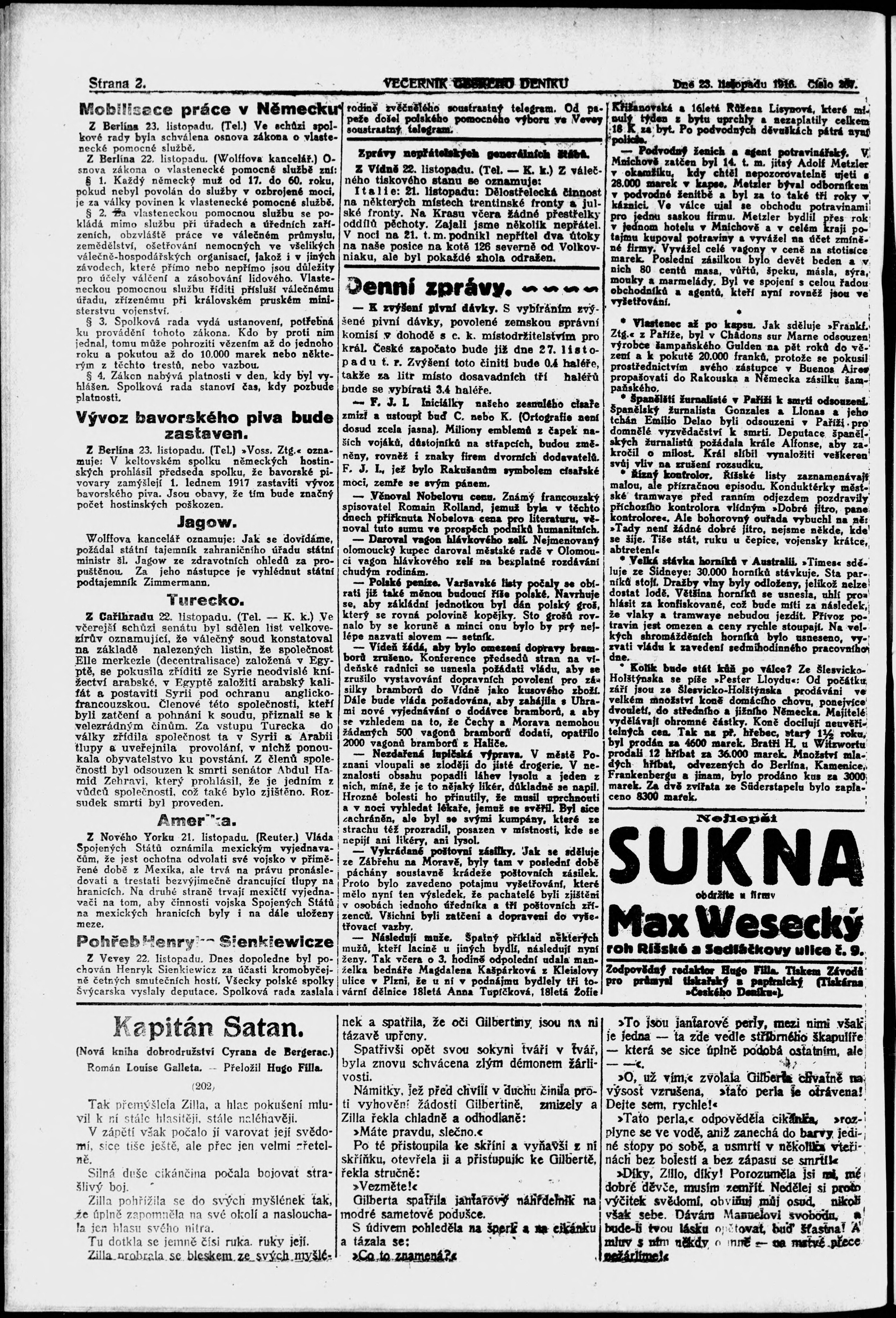 * Datum vydání výtisku: 23.11.1916 Číslo výtisku: 267 Poznámky k výtisku: večerní vydání;