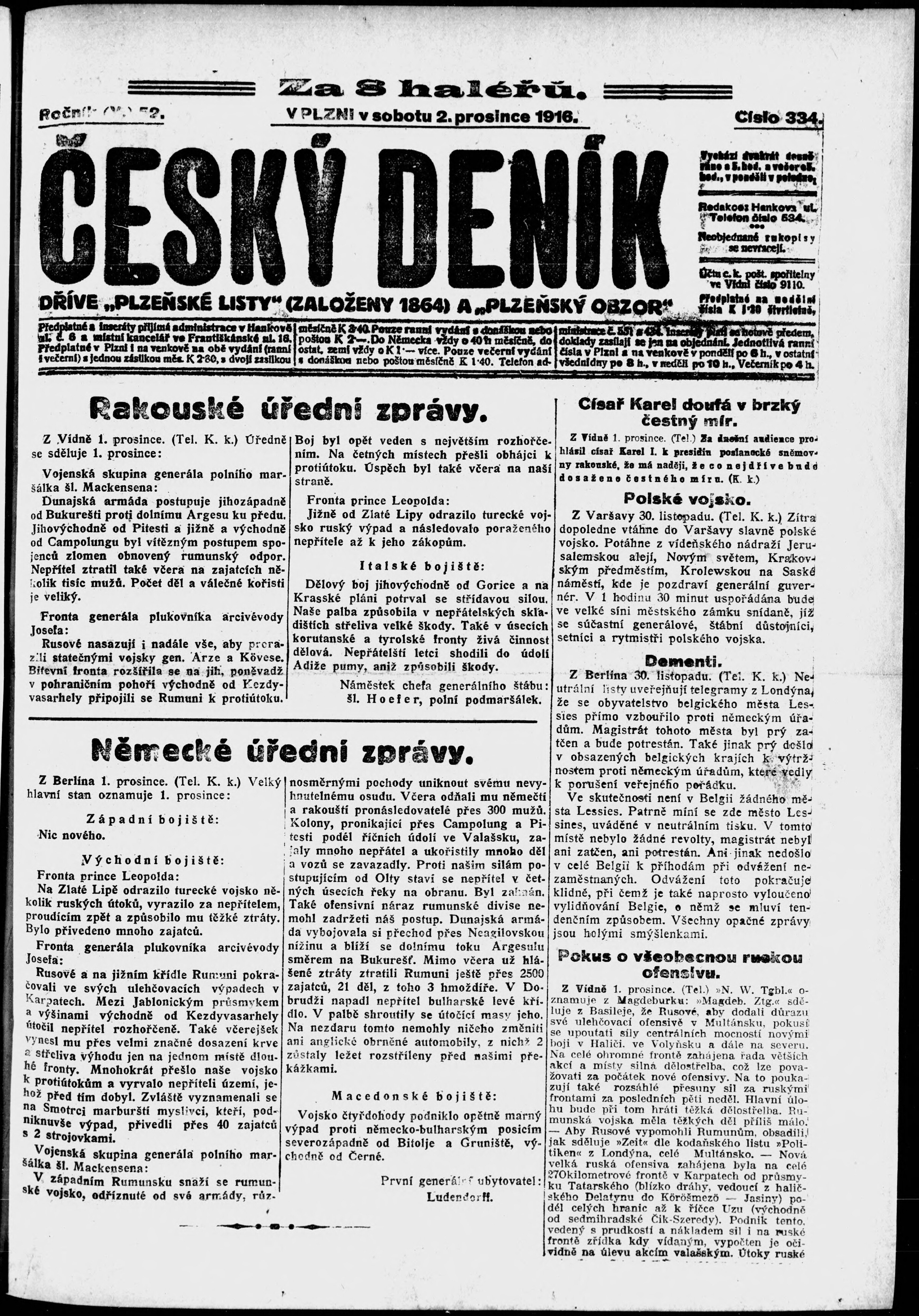 * Datum vydání výtisku: 2.12.1916 Číslo výtisku: 334