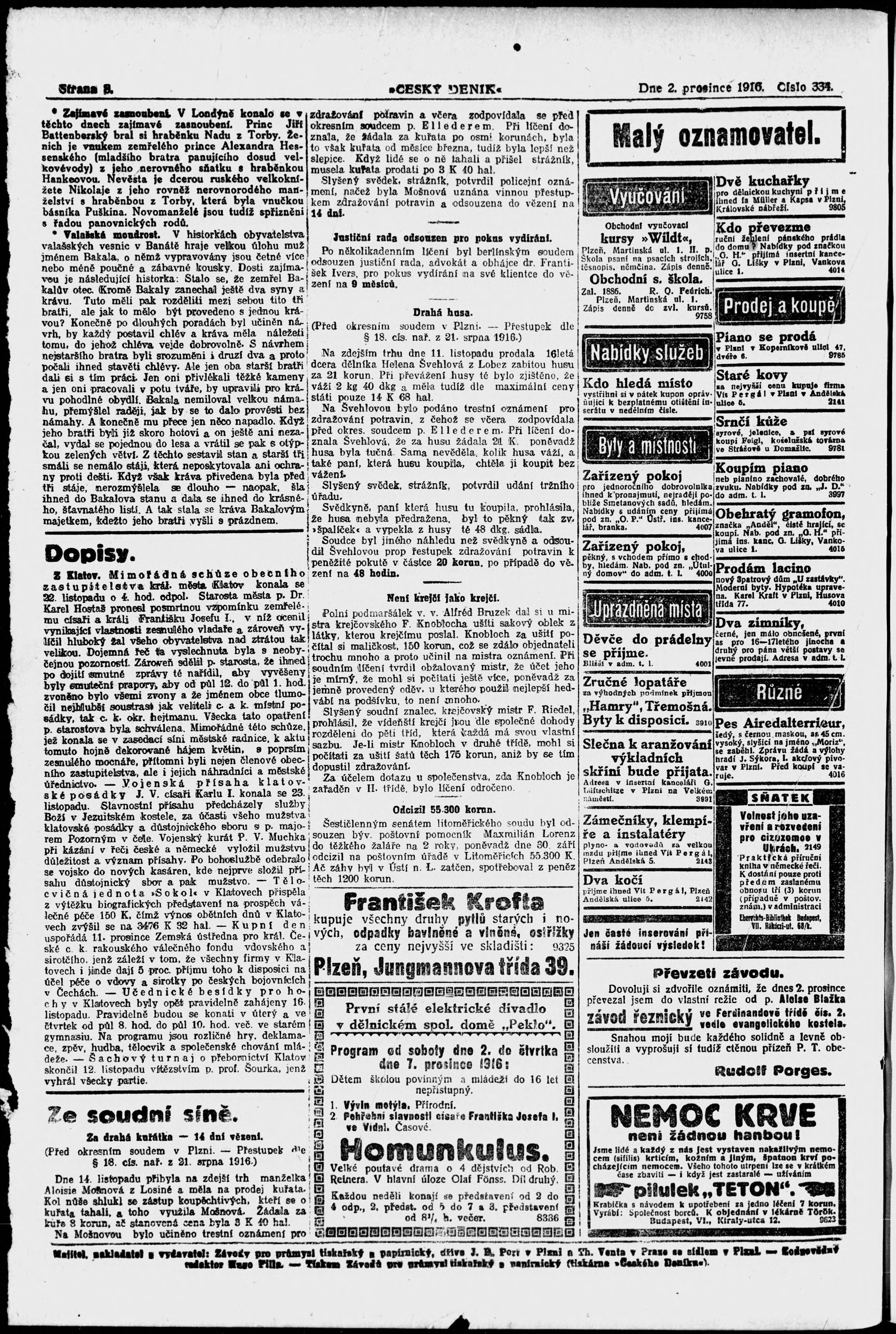 * Datum vydání výtisku: 2.12.1916 Číslo výtisku: 334