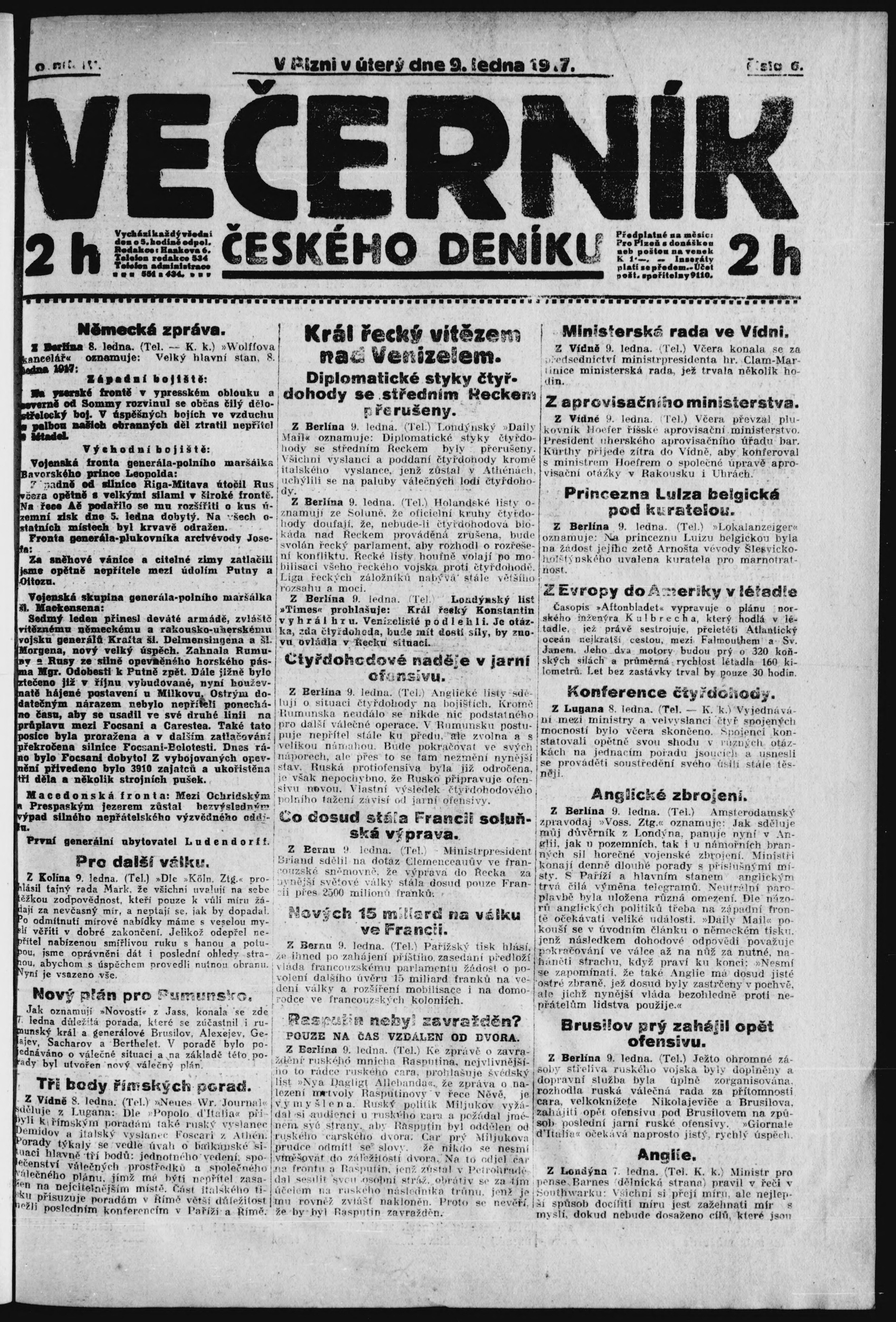 * Datum vydání výtisku: 9.1.1917 Číslo výtisku: 6 Poznámky k výtisku: večerní vydání;