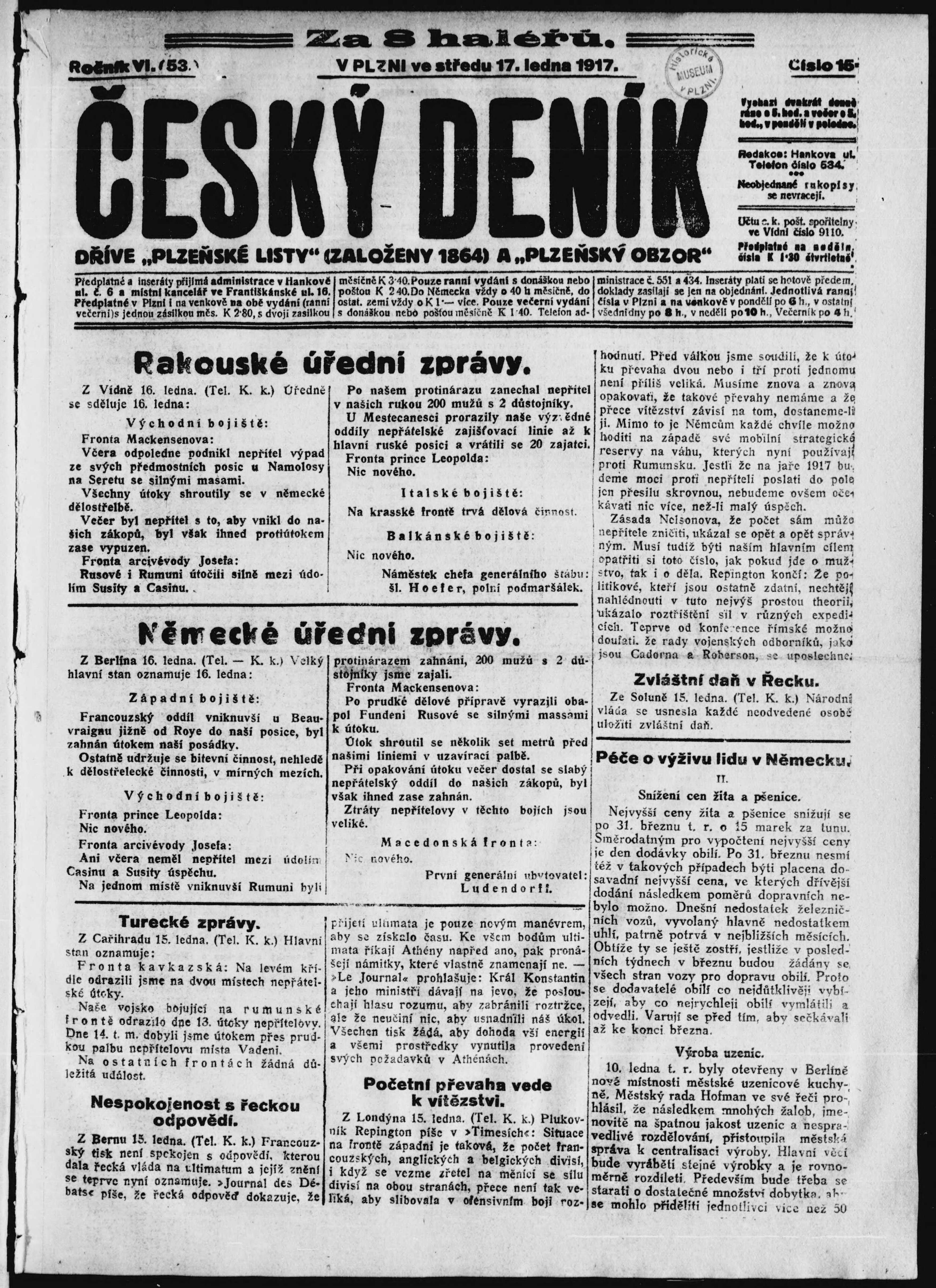* Datum vydání výtisku: 15.1.1917 Číslo výtisku: 13
