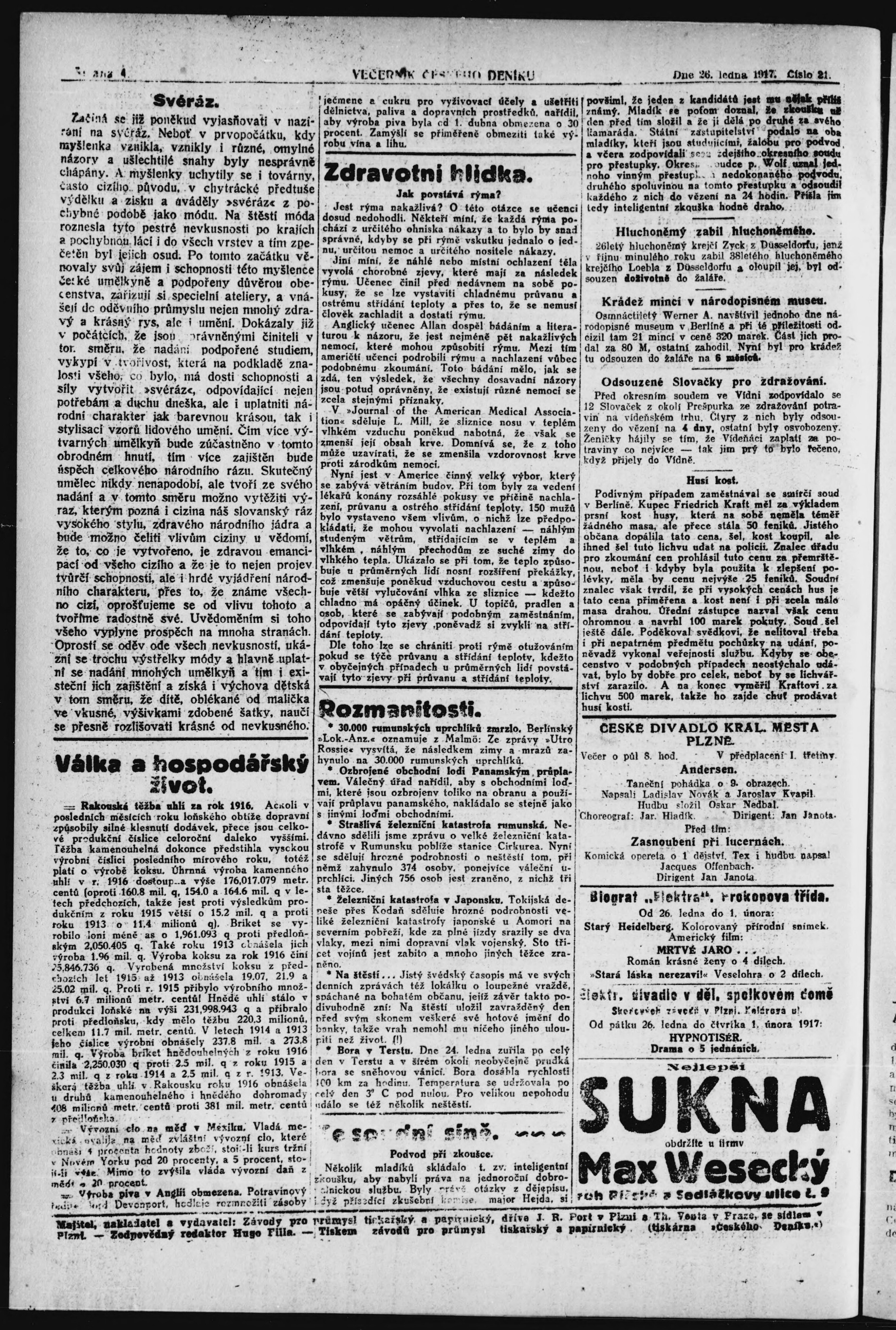 * Datum vydání výtisku: 26.1.1917 Číslo výtisku: 21 Poznámky k výtisku: večerní vydání;
