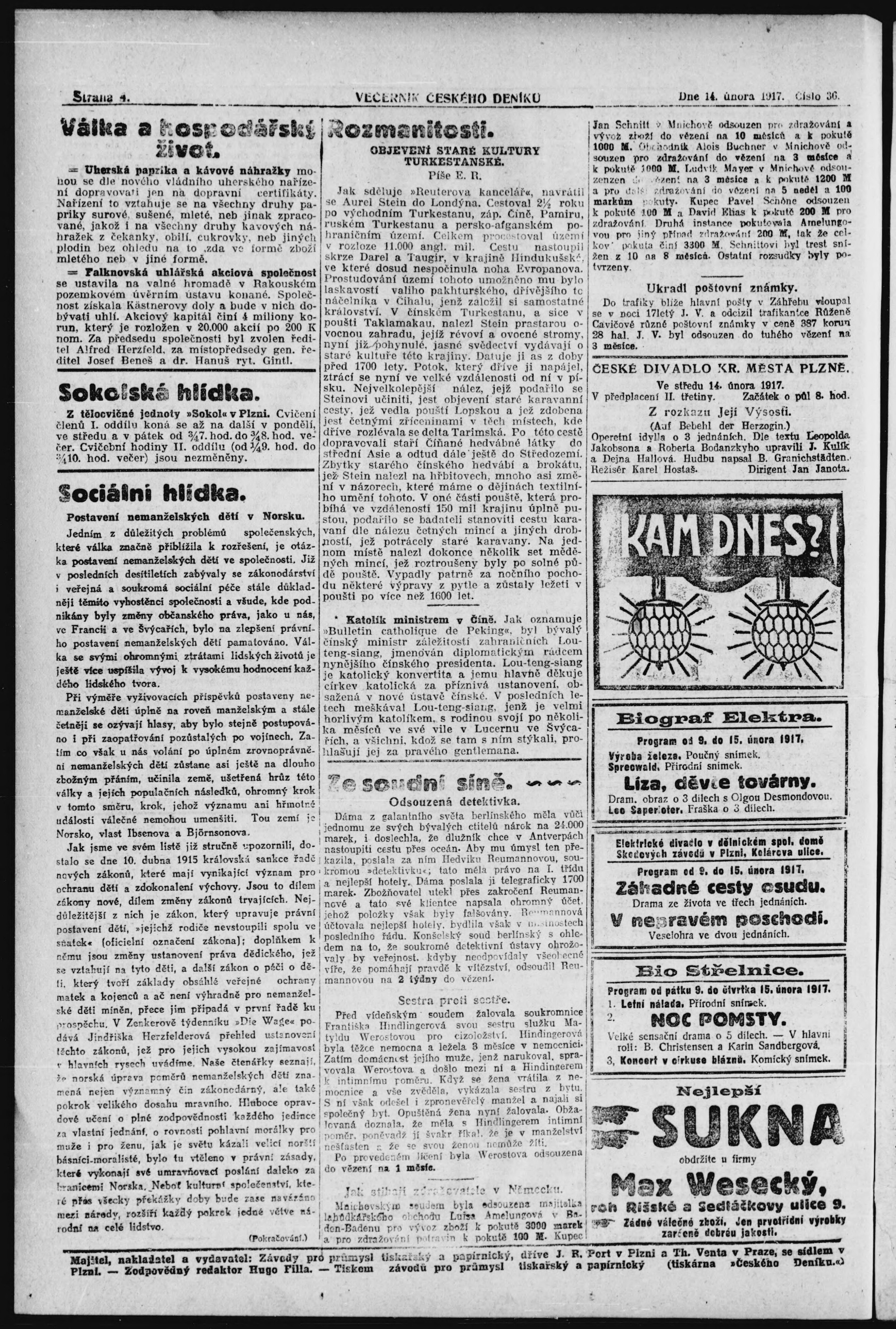* Datum vydání výtisku: 14.2.1917 Číslo výtisku: 36 Poznámky k výtisku: večerní vydání;