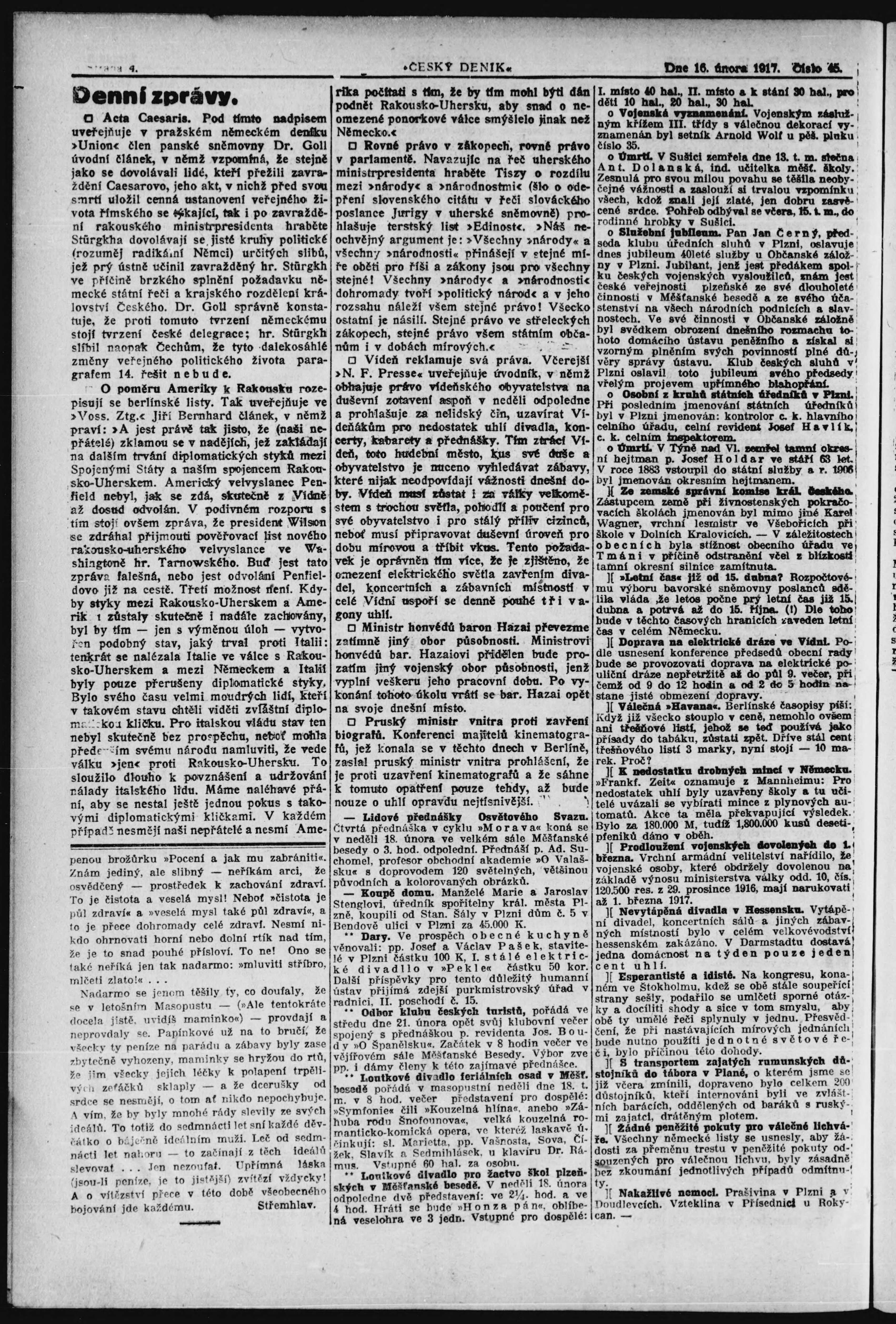 * Datum vydání výtisku: 16.2.1917 Číslo výtisku: 45