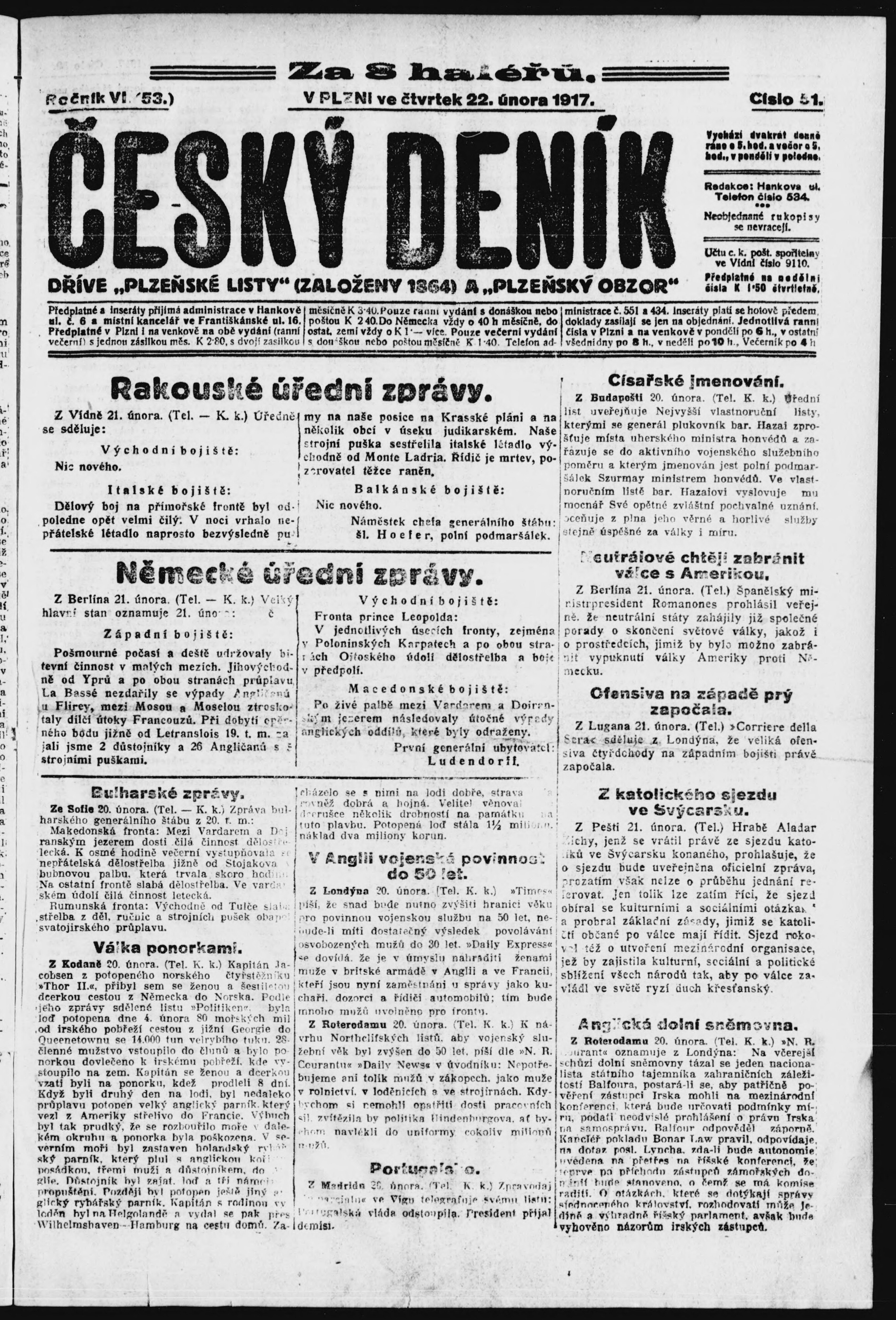 * Datum vydání výtisku: 22.2.1917 Číslo výtisku: 51