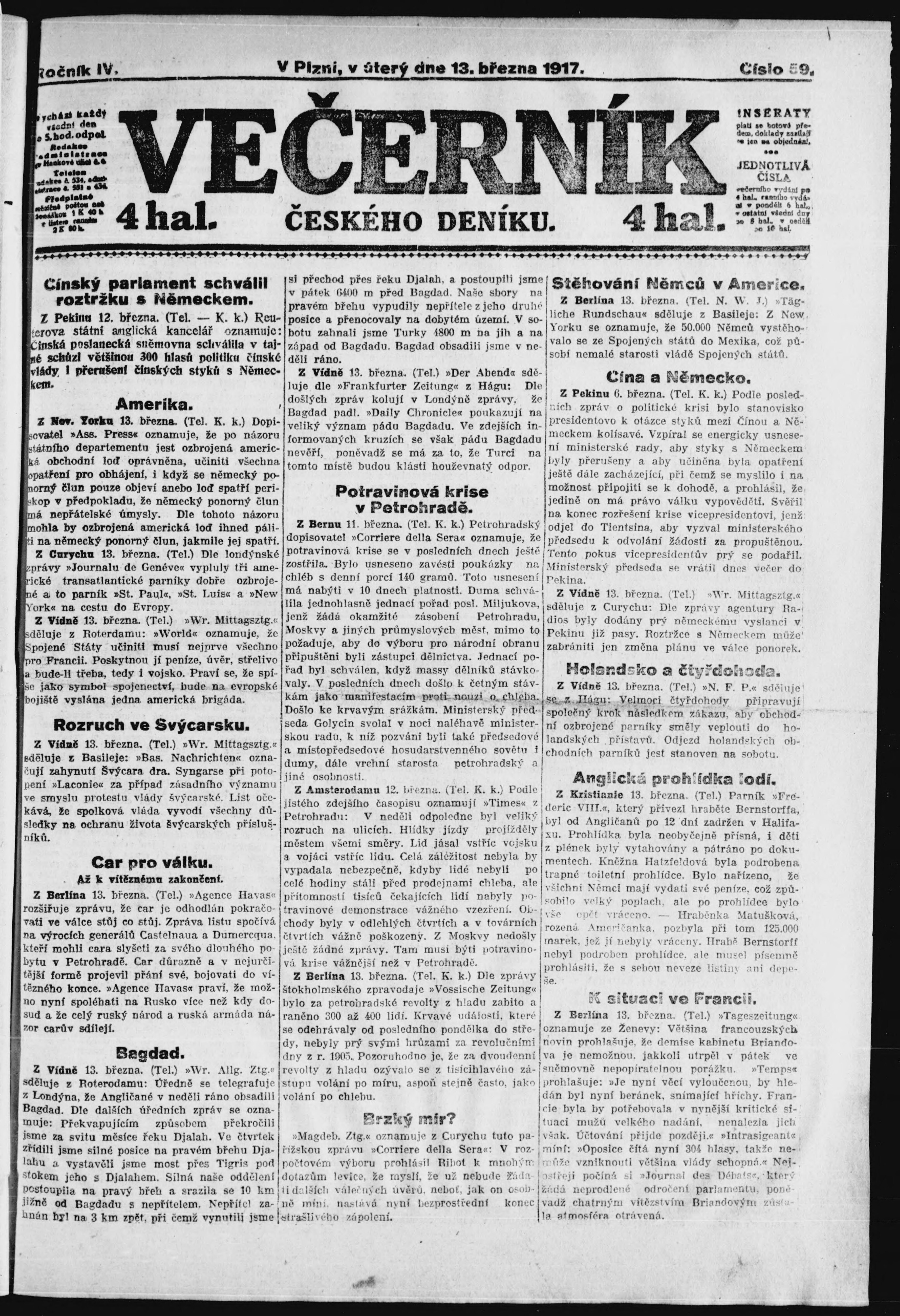 * Datum vydání výtisku: 13.3.1917 Číslo výtisku: 59 Poznámky k výtisku: večerní vydání;
