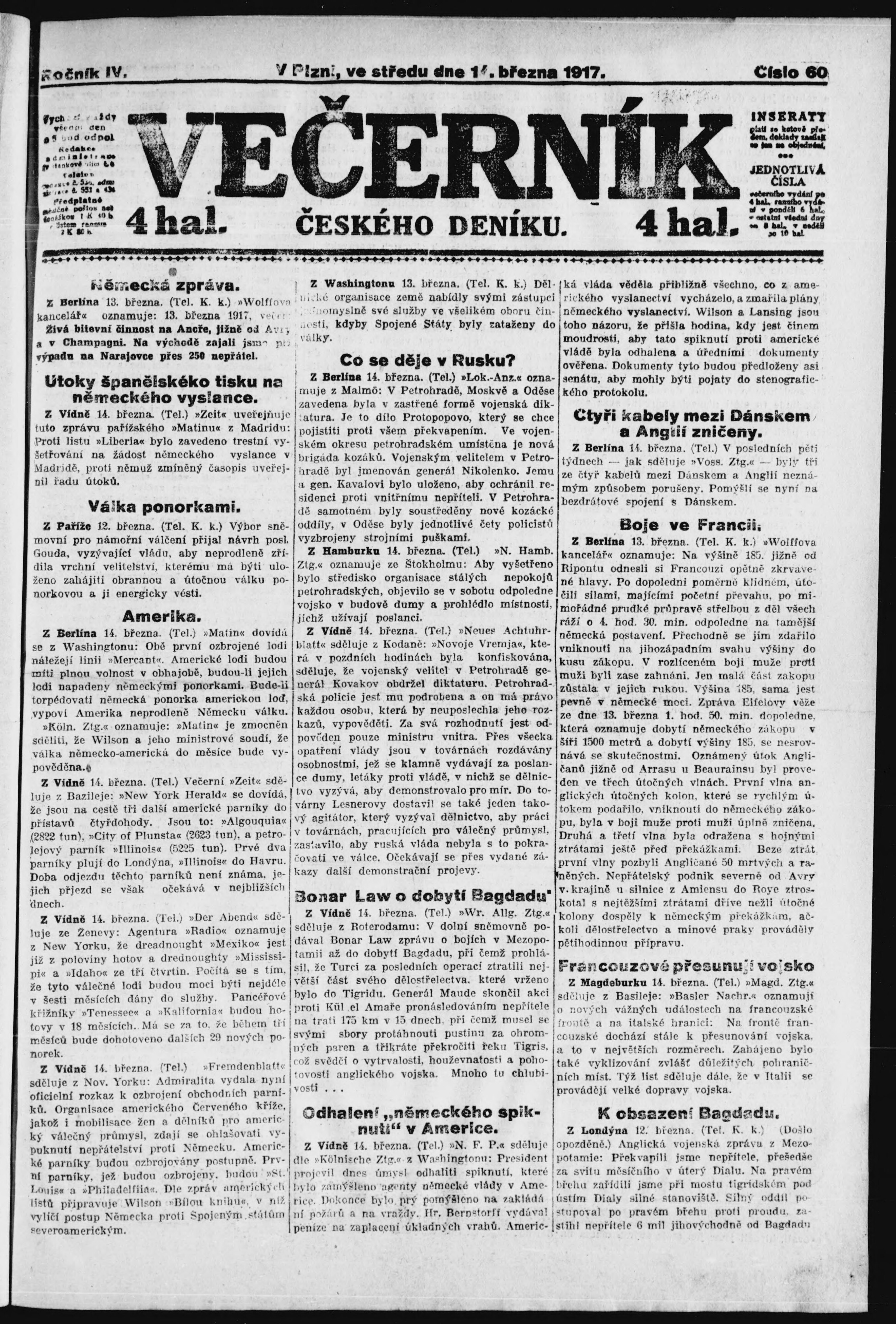* Datum vydání výtisku: 14.3.1917 Číslo výtisku: 60 Poznámky k výtisku: večerní vydání;