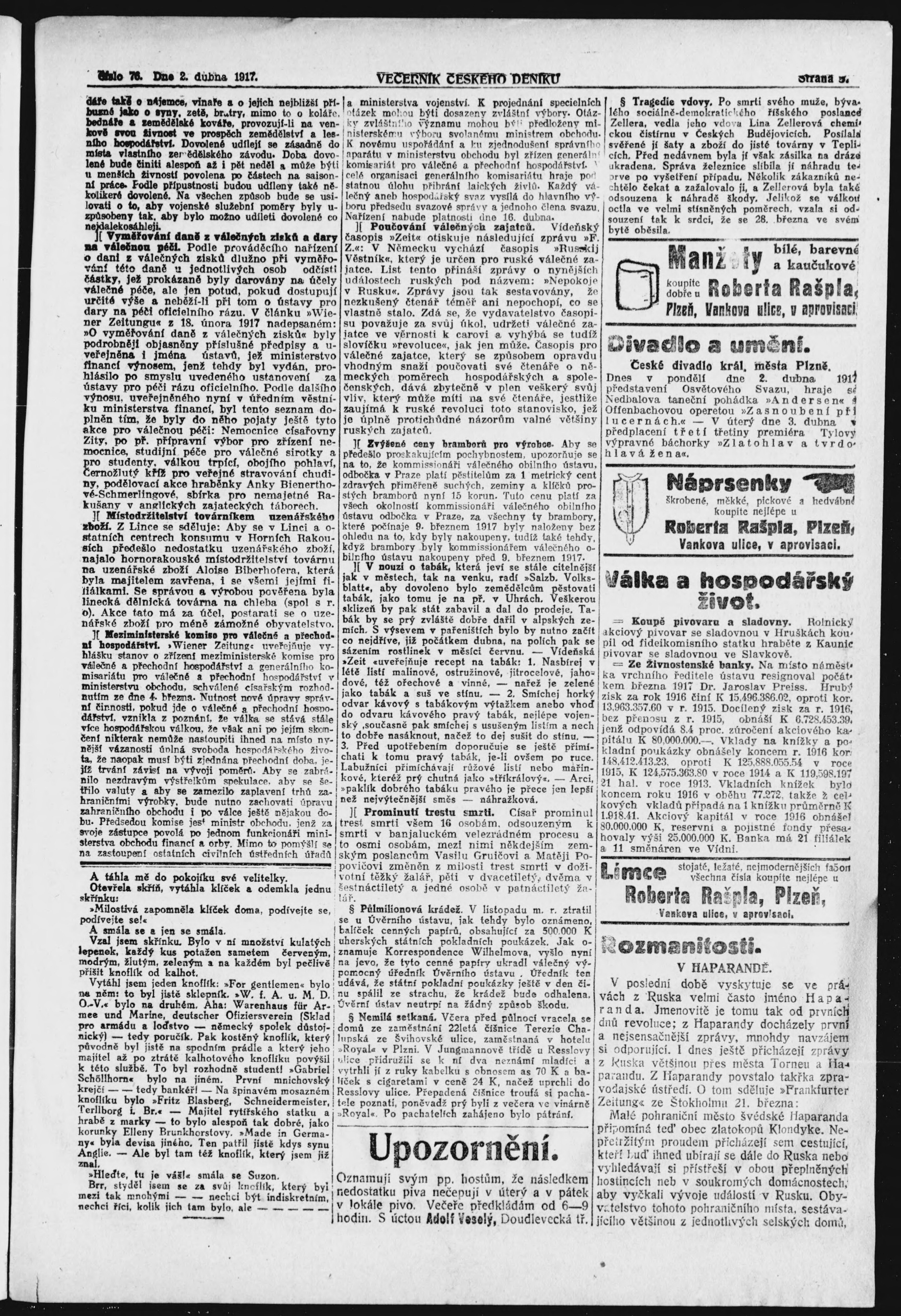 * Datum vydání výtisku: 2.4.1917 Číslo výtisku: 76 Poznámky k výtisku: večerní vydání;