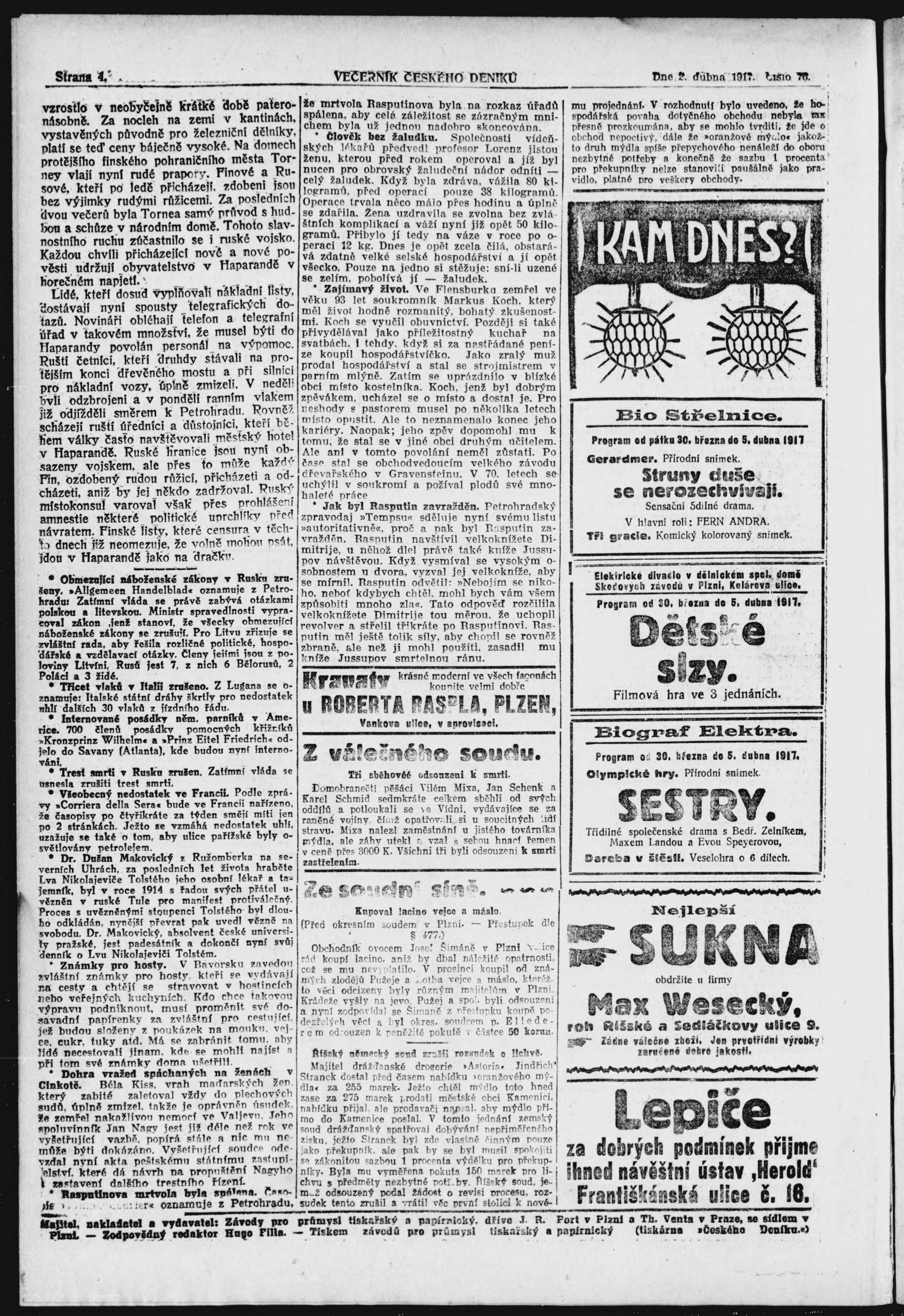 * Datum vydání výtisku: 2.4.1917 Číslo výtisku: 76 Poznámky k výtisku: večerní vydání;