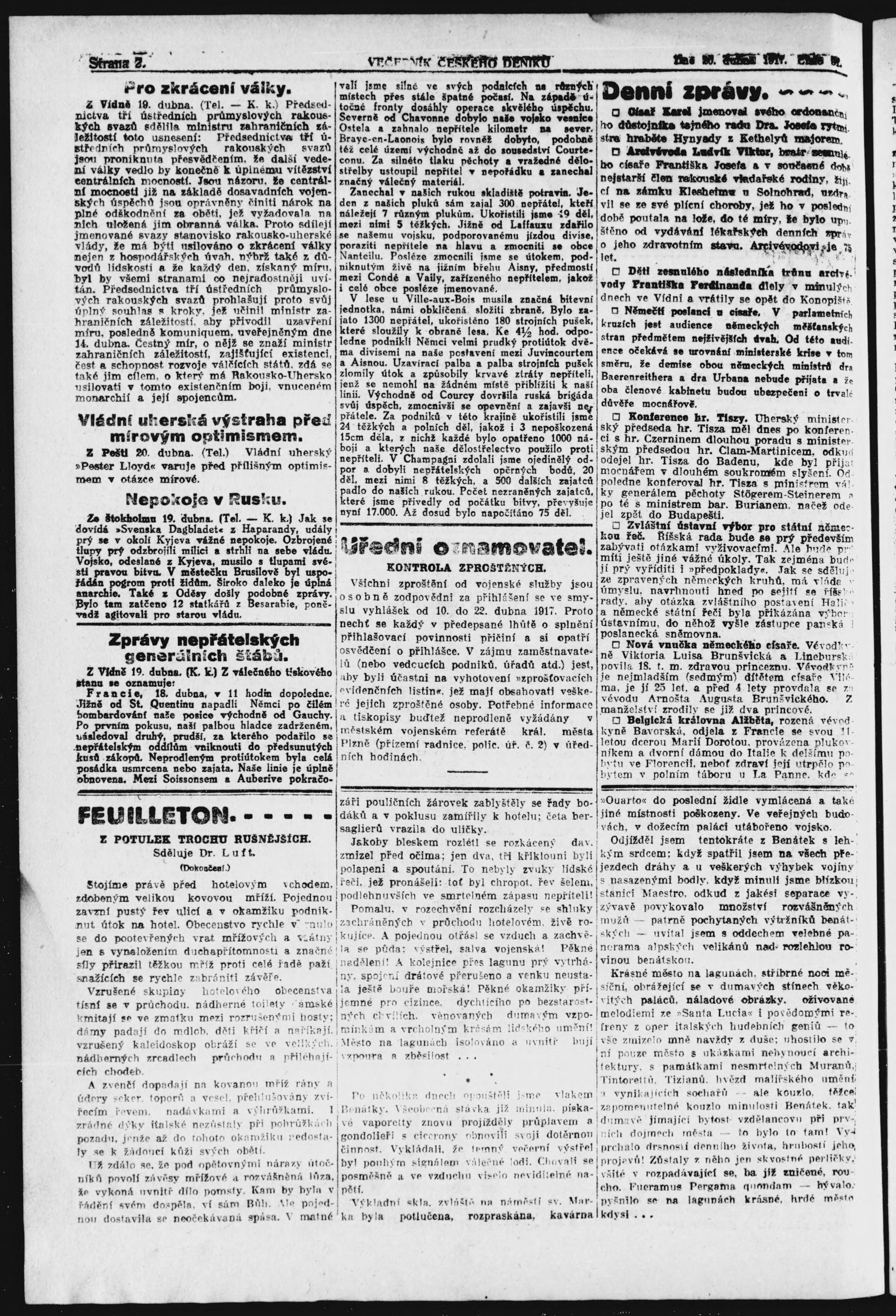 * Datum vydání výtisku: 20.4.1917 Číslo výtisku: 91 Poznámky k výtisku: večerní vydání;