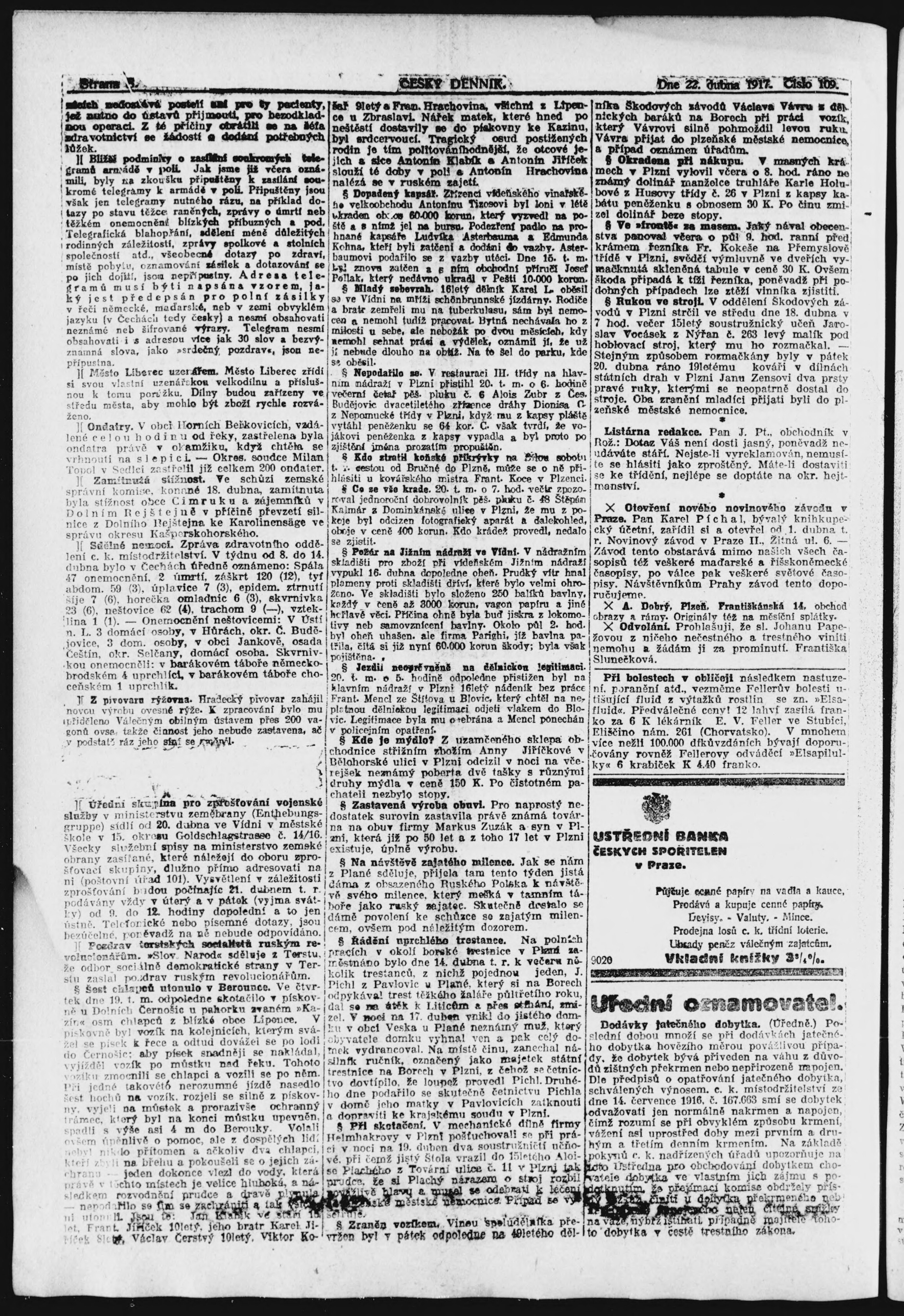 * Datum vydání výtisku: 22.4.1917 Číslo výtisku: 109