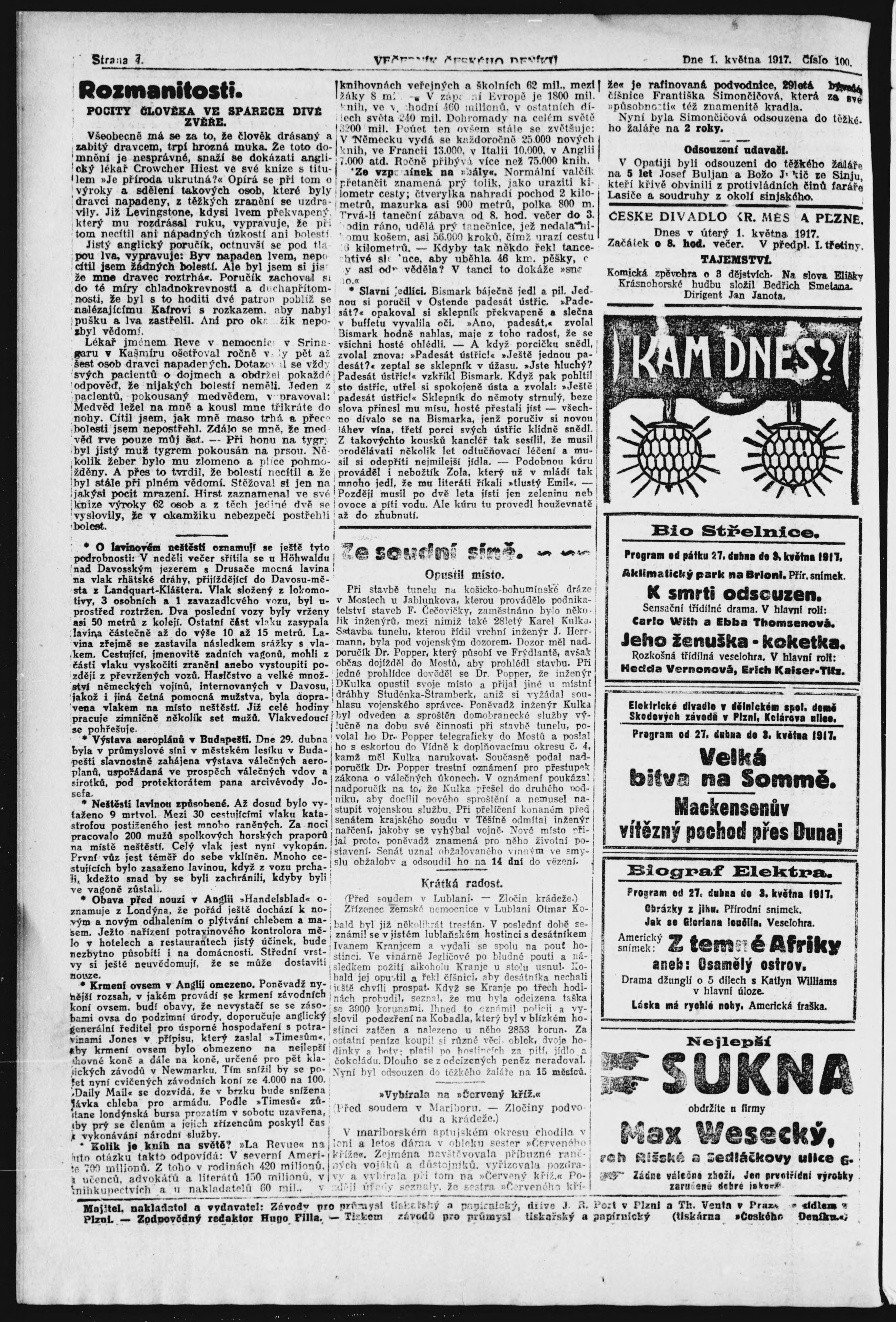 * Datum vydání výtisku: 1.5.1917 Číslo výtisku: 100 Poznámky k výtisku: večerní vydání;