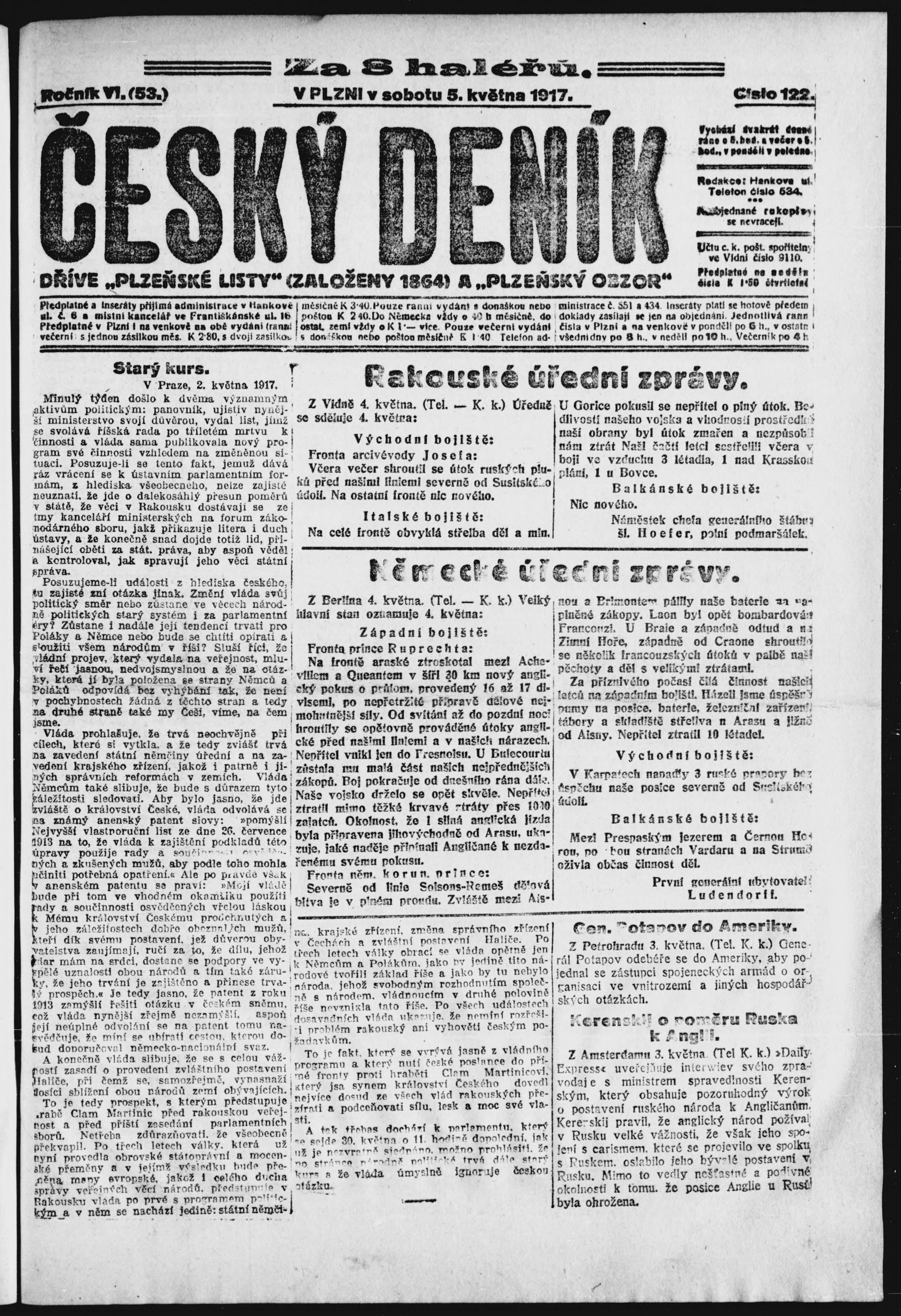* Datum vydání výtisku: 5.5.1917 Číslo výtisku: 122