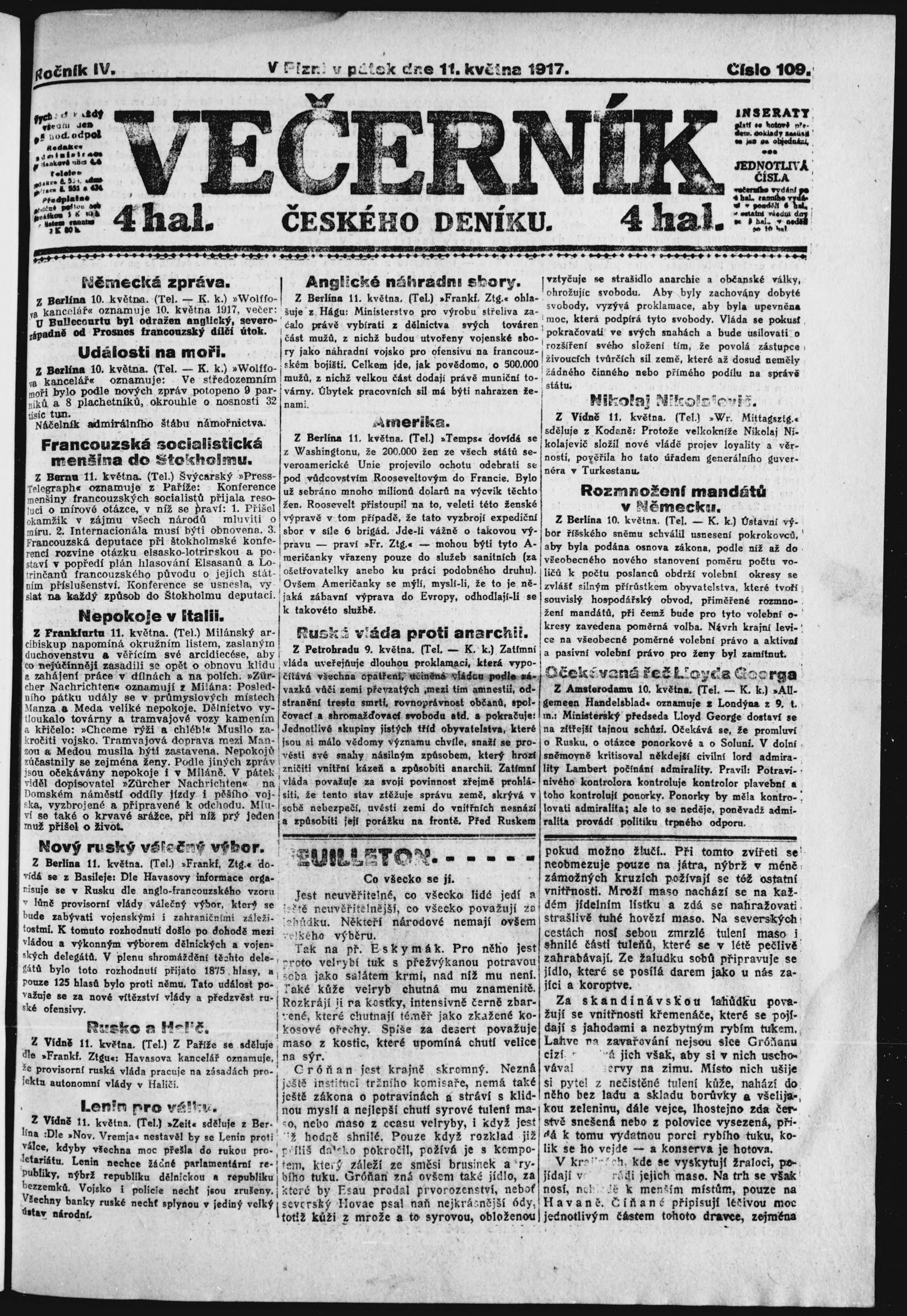 * Datum vydání výtisku: 11.5.1917 Číslo výtisku: 109 Poznámky k výtisku: večerní vydání;