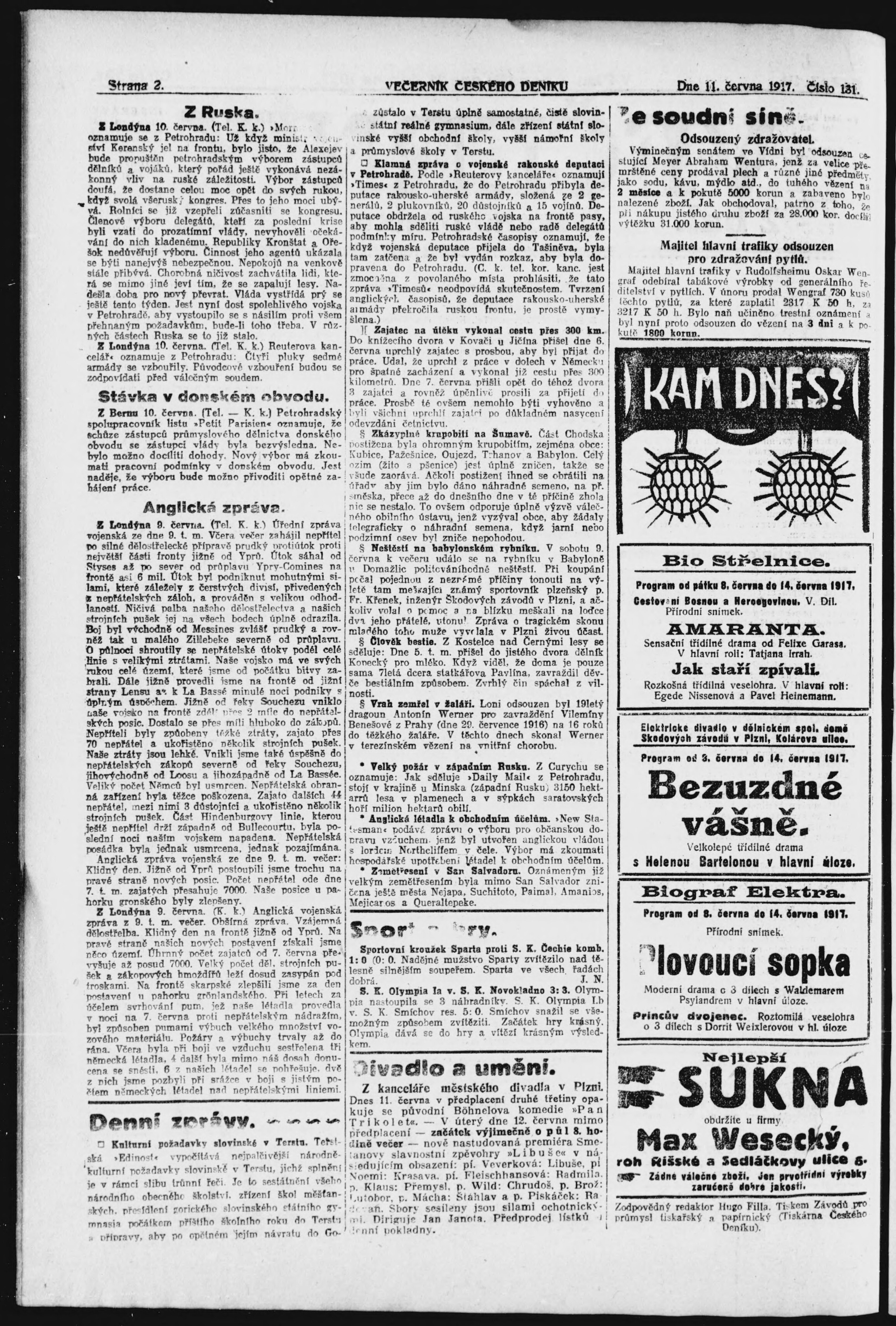* Datum vydání výtisku: 11.6.1917 Číslo výtisku: 131 Poznámky k výtisku: večerní vydání;