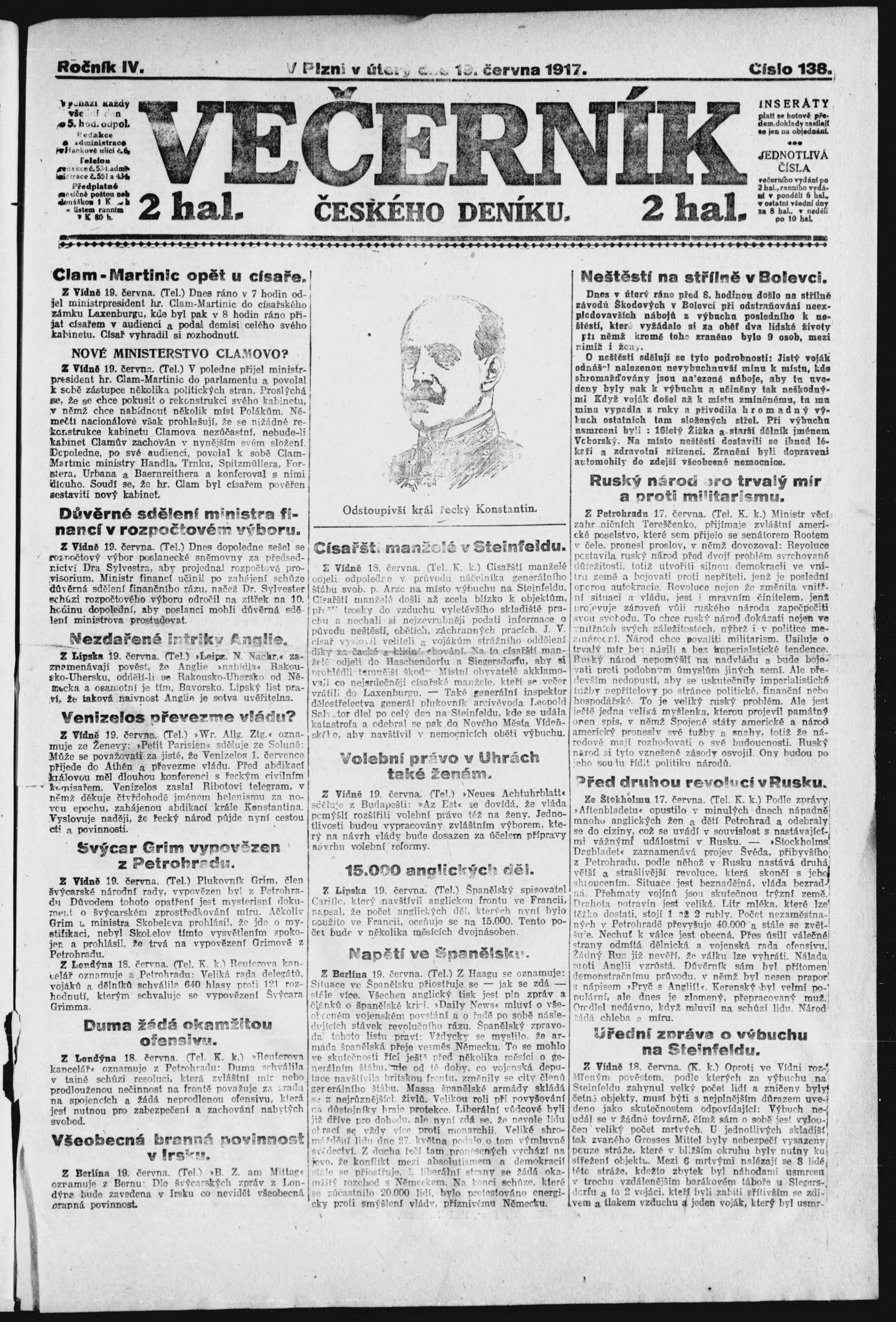 * Datum vydání výtisku: 19.6.1917 Číslo výtisku: 138 Poznámky k výtisku: večerní vydání;