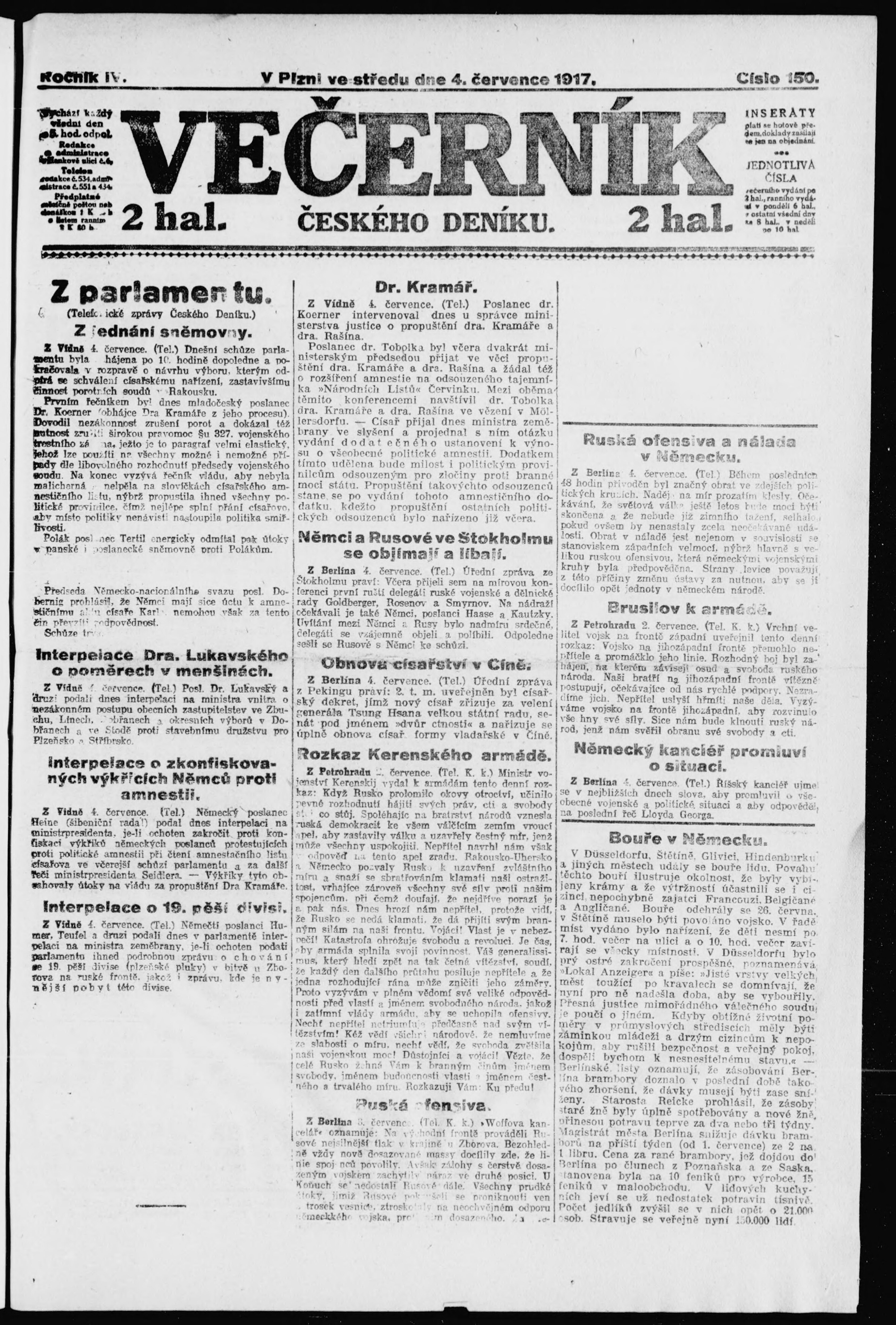 * Datum vydání výtisku: 4.7.1917 Číslo výtisku: 150 Poznámky k výtisku: večerní vydání;