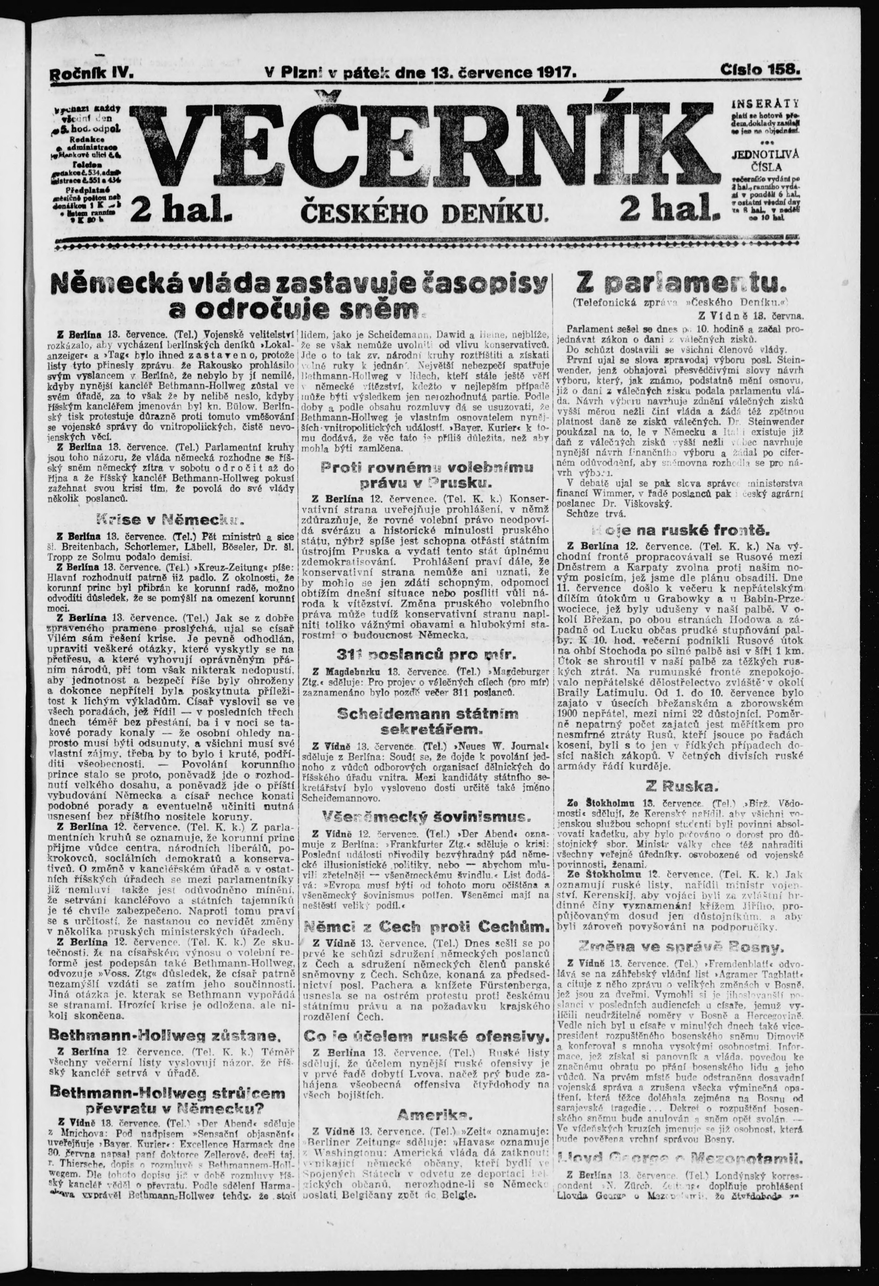 * Datum vydání výtisku: 13.7.1917 Číslo výtisku: 158 Poznámky k výtisku: večerní vydání;