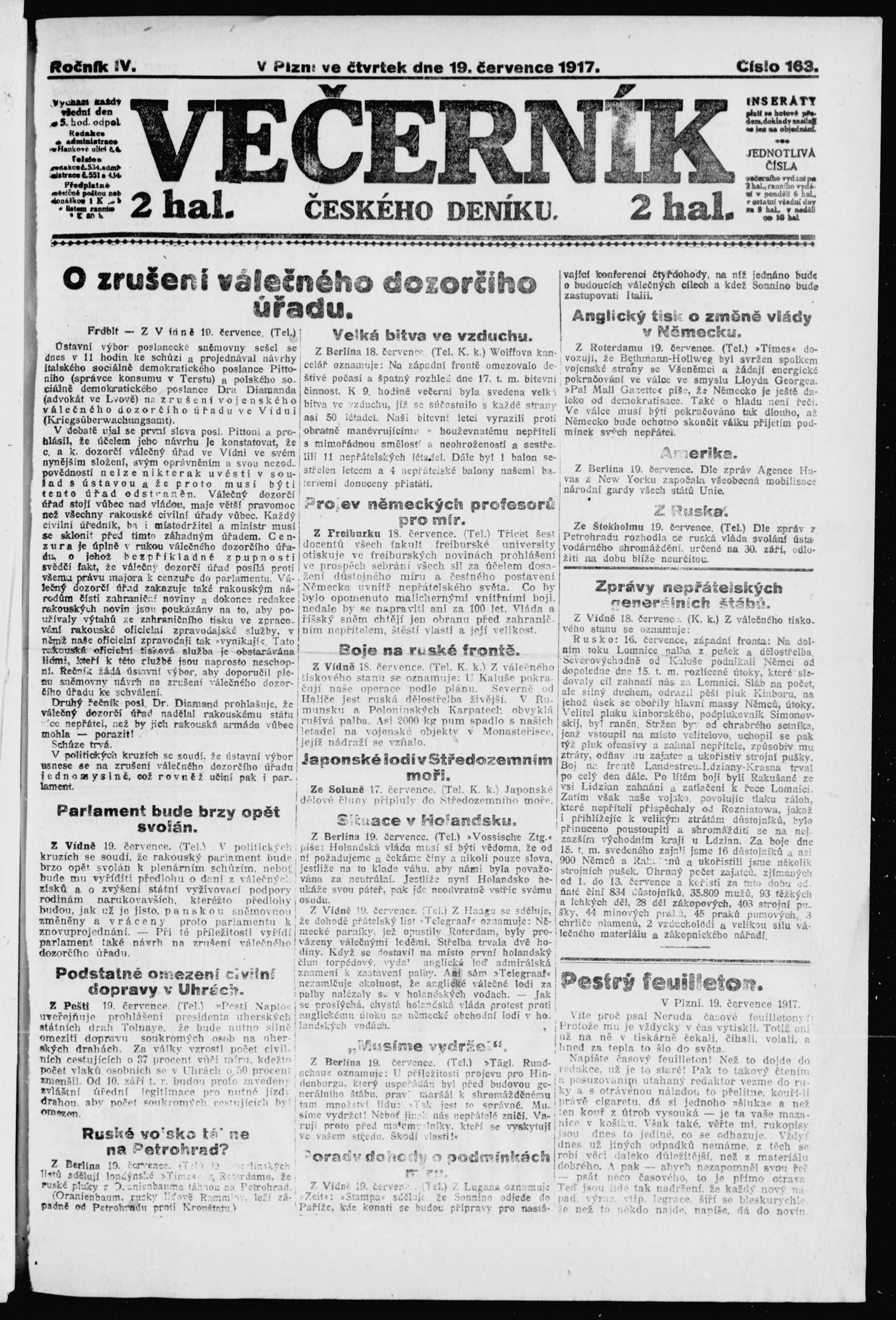 * Datum vydání výtisku: 19.7.1917 Číslo výtisku: 163 Poznámky k výtisku: večerní vydání;