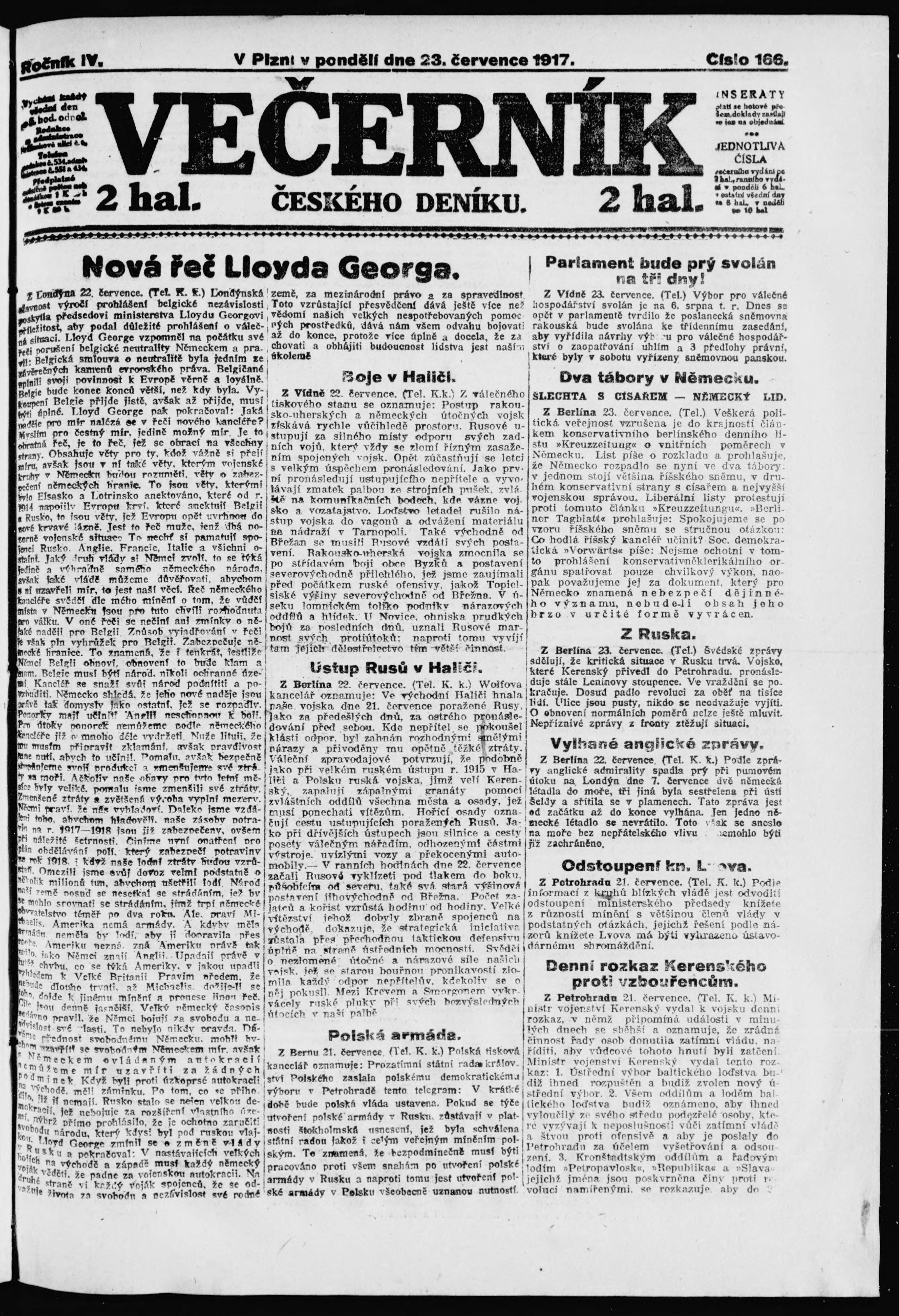 * Datum vydání výtisku: 23.7.1917 Číslo výtisku: 166 Poznámky k výtisku: večerní vydání;