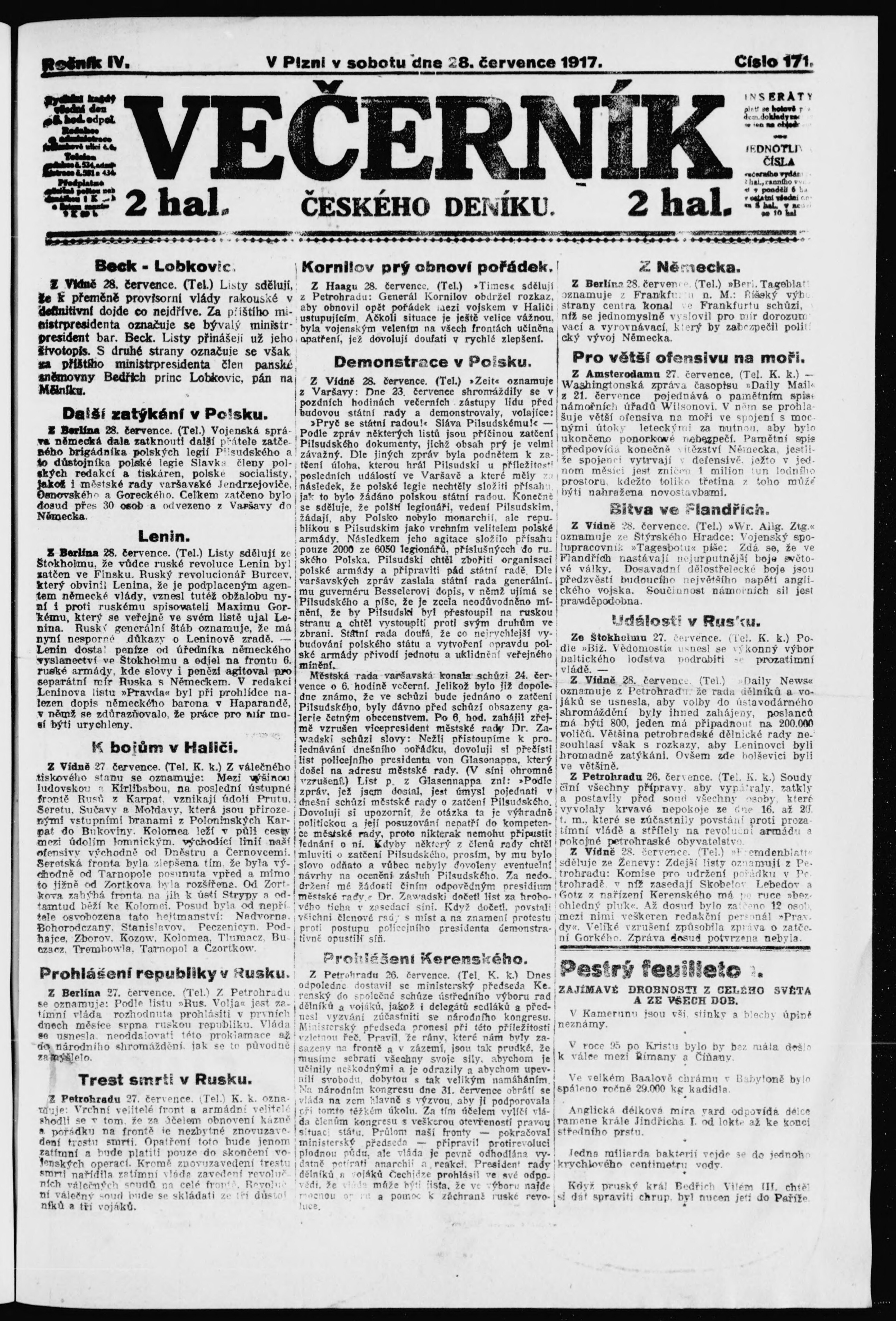 * Datum vydání výtisku: 28.7.1917 Číslo výtisku: 171 Poznámky k výtisku: večerní vydání;