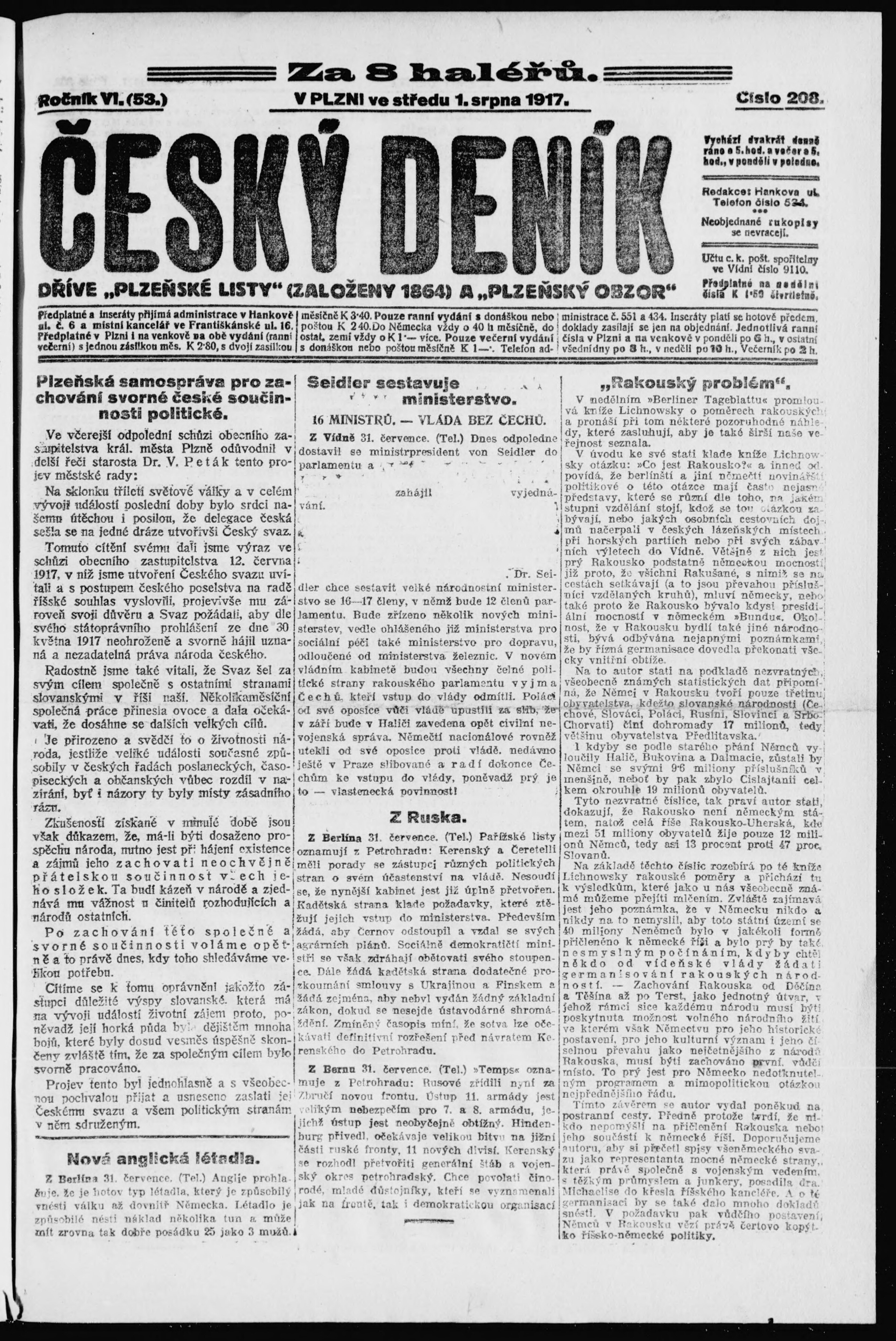 * Datum vydání výtisku: 1.8.1917 Číslo výtisku: 208