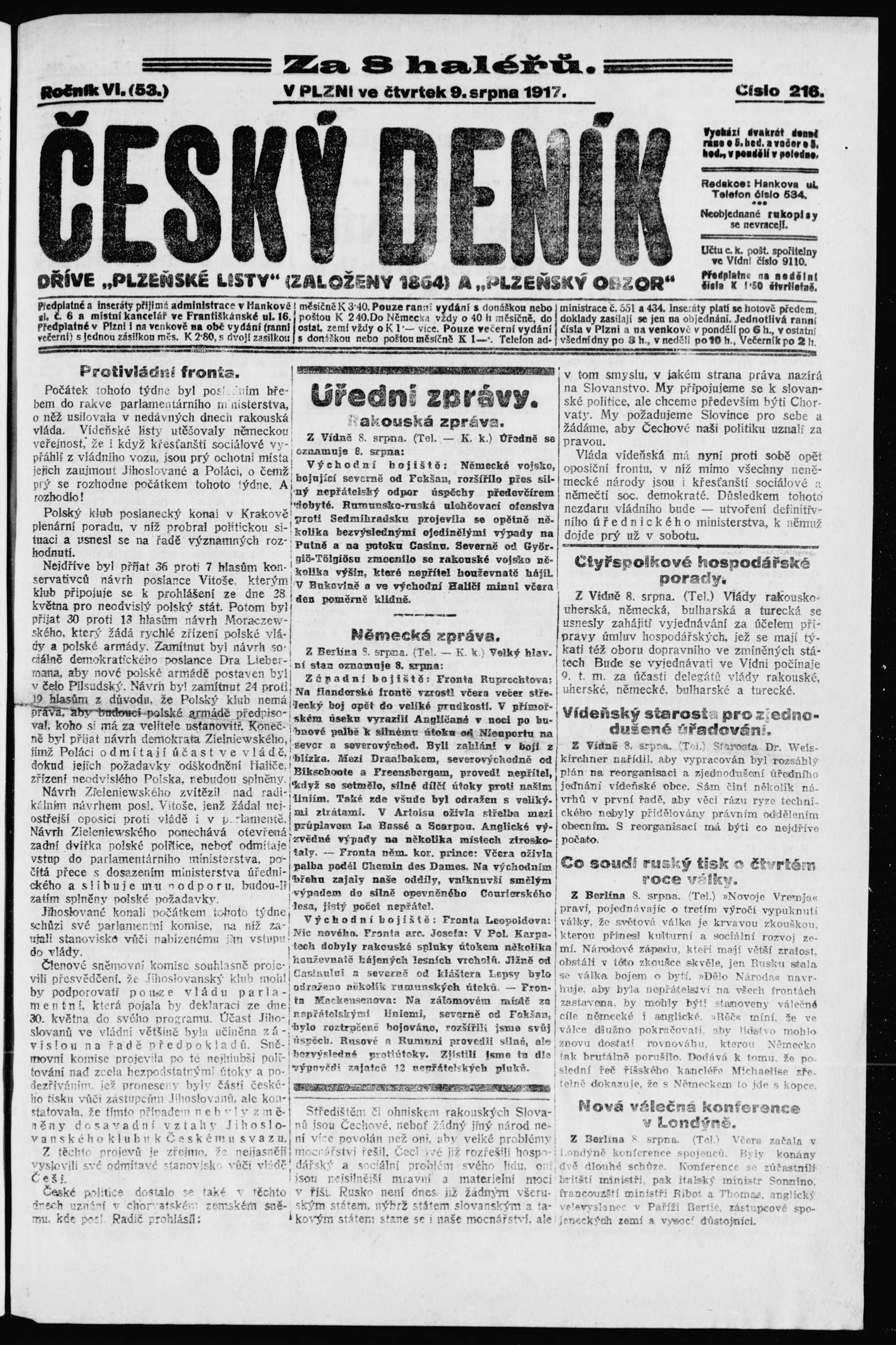 * Datum vydání výtisku: 9.8.1917 Číslo výtisku: 216